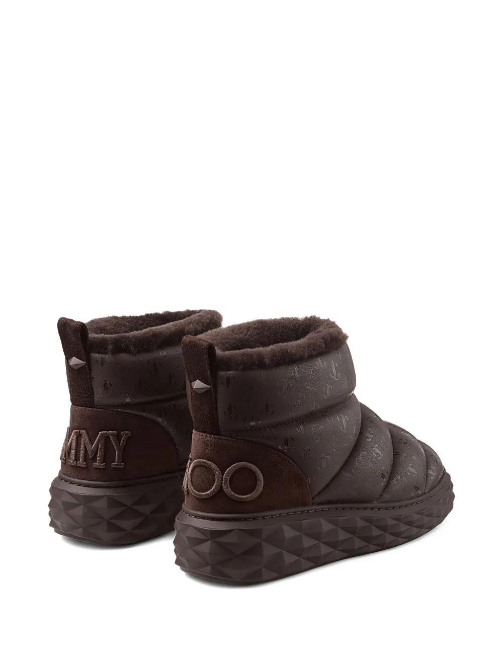 chocolate brown logo detail quilted design pull tab fur trim geometric sole