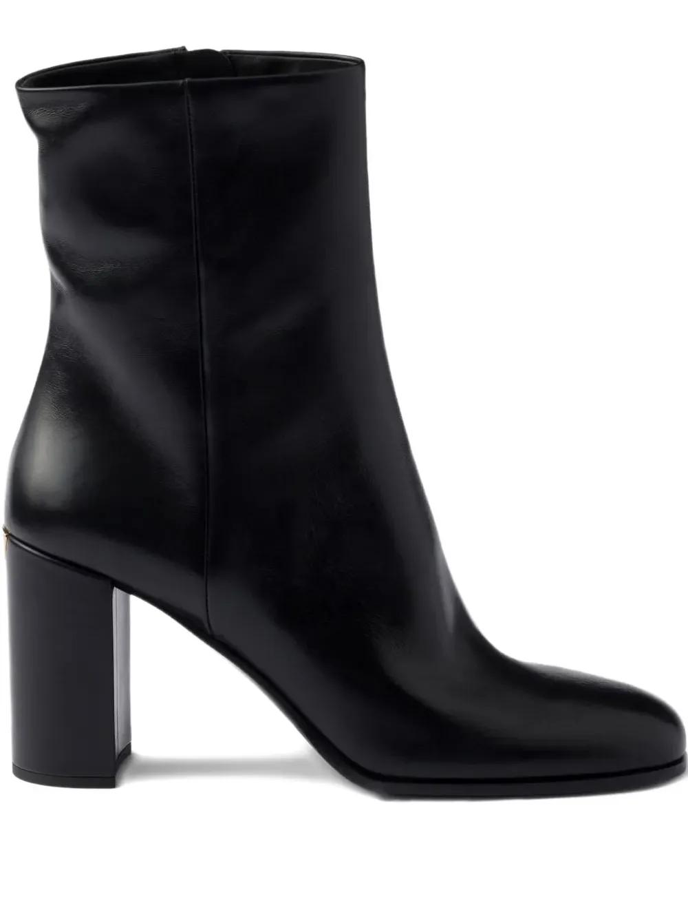 black calf leather gold-tone hardware tonal stitching engraved logo almond toe side zip fastening branded insole 85mm block heel leather sole