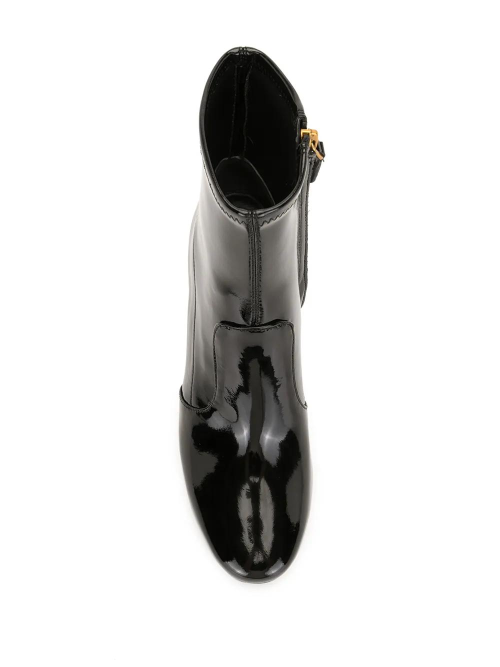 black patent leather panelled design round toe mid block heel side zip fastening leather sole