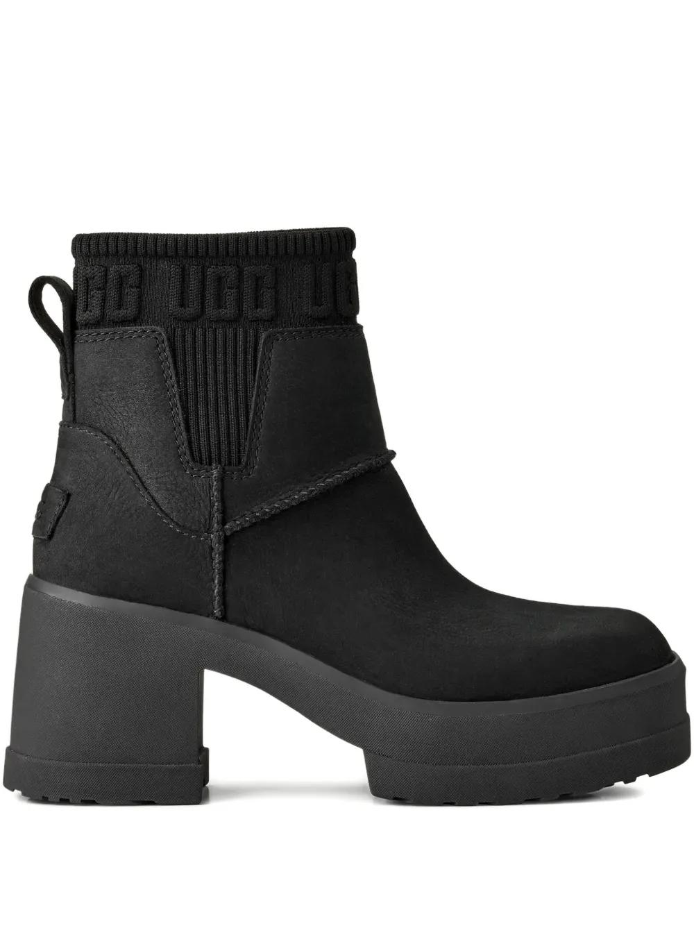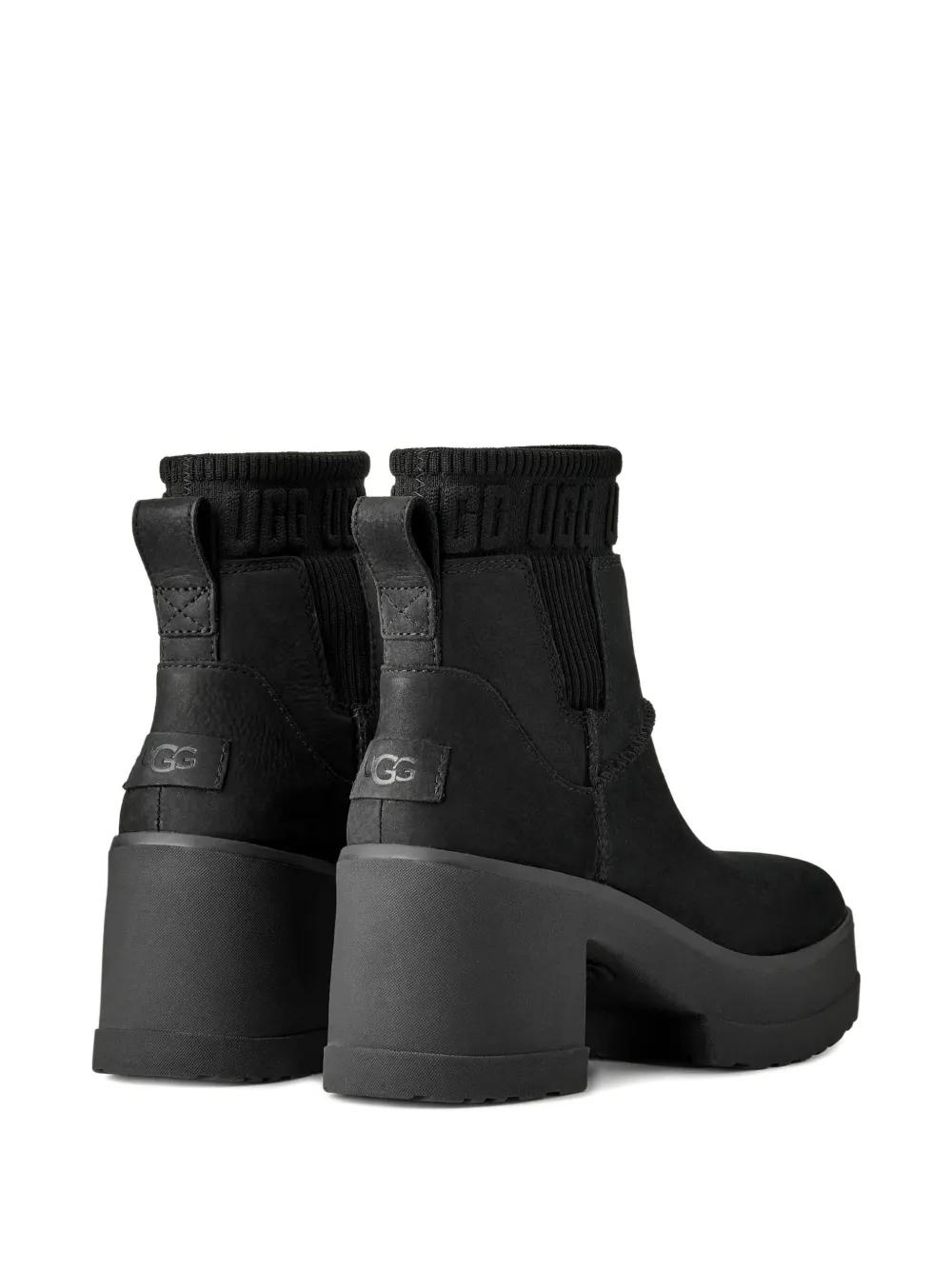 black suede block heel pull tab at the rear elasticated side panels platform sole