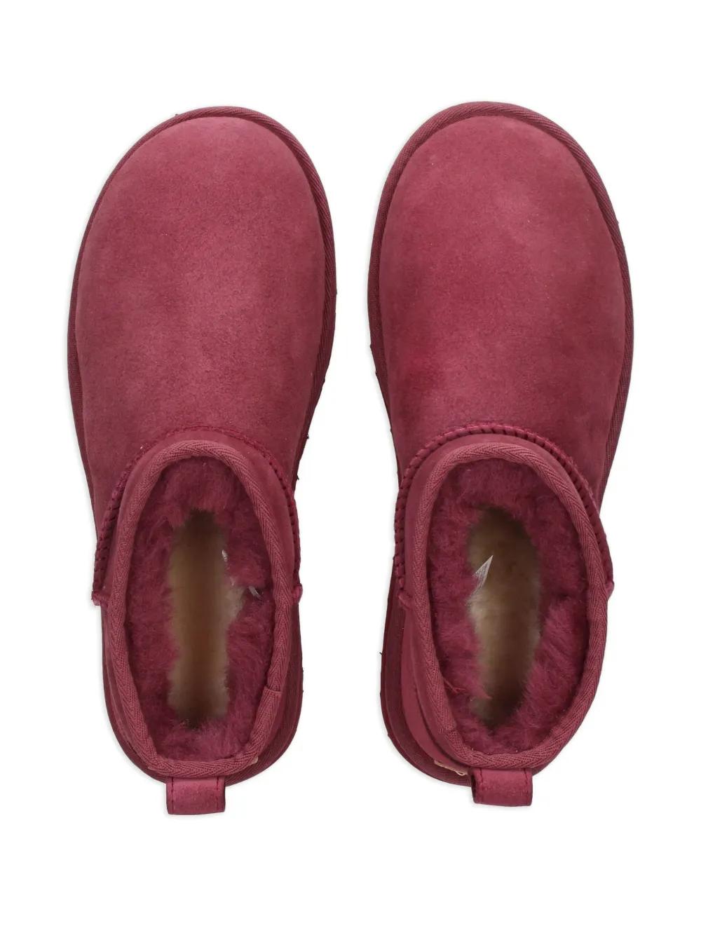 burnt mahogany suede leather upper folded cuff sheepskin lining rubber outsole low heel