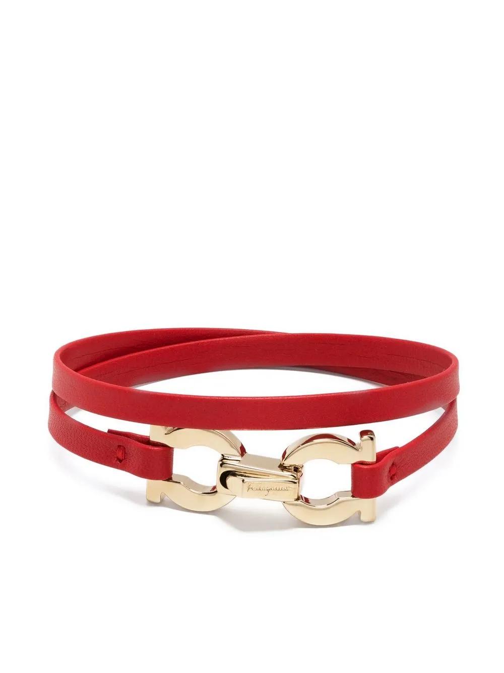 Gancini-plaque leather bracelet from SALVATORE FERRAGAMO featuring bright red, calf leather, gold-tone hardware, Gancini plaque and wraparound bracelet.
