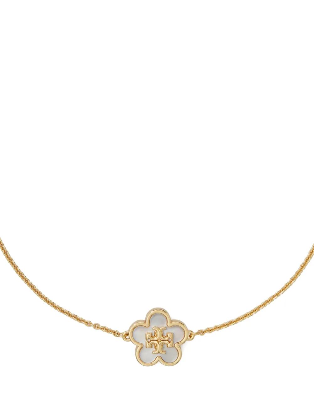 gold-tone 18kt gold plated/mother-of-pearl cable-link chain logo plaque charm detail floral motif spring-ring fastening