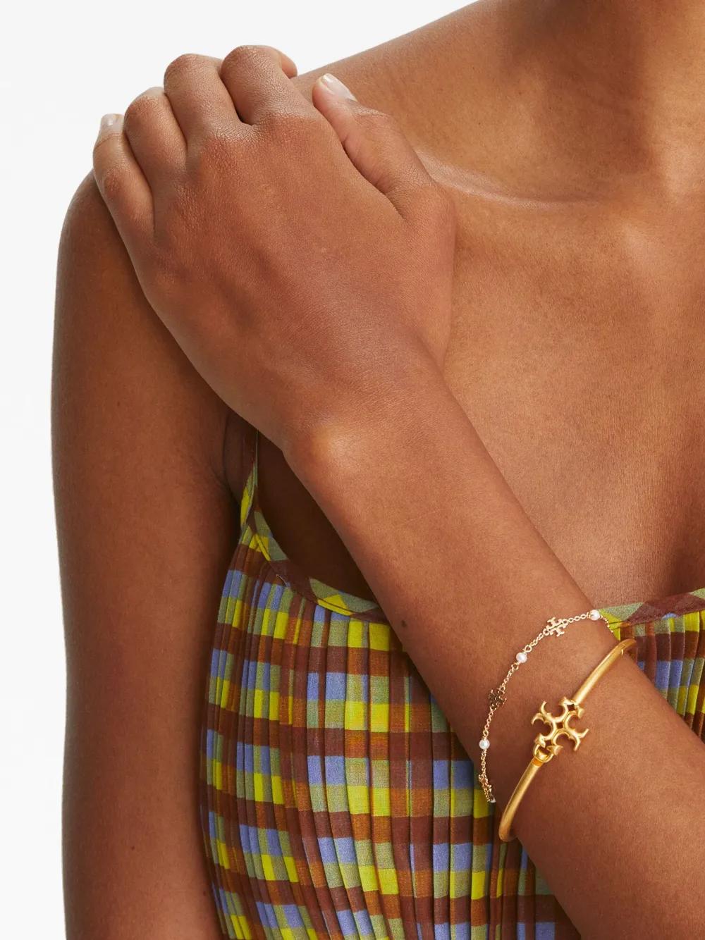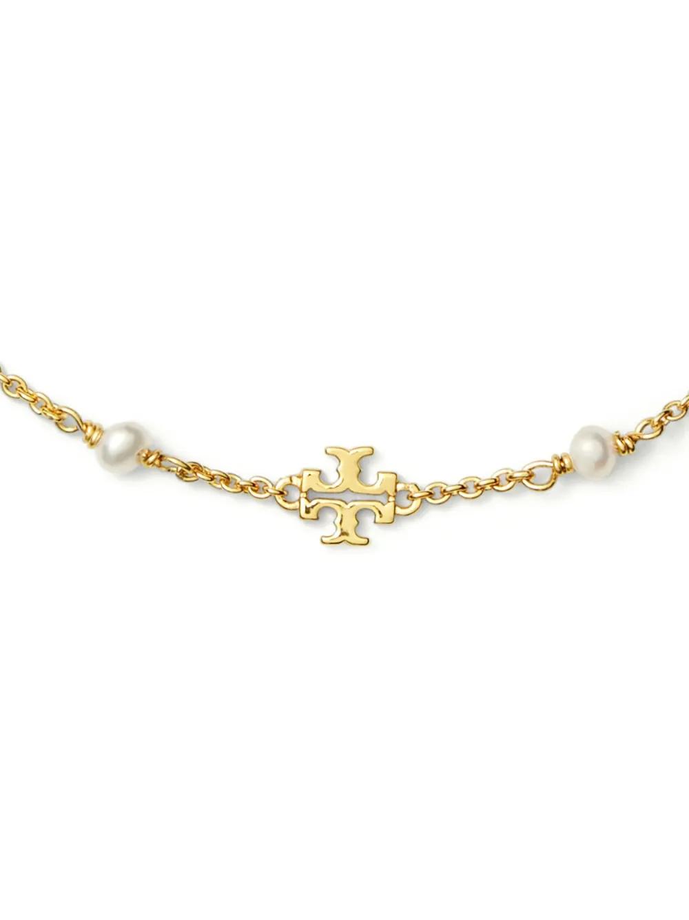 gold-tone logo plaque 18kt gold plated pearl detail chain bracelet spring-ring fastening