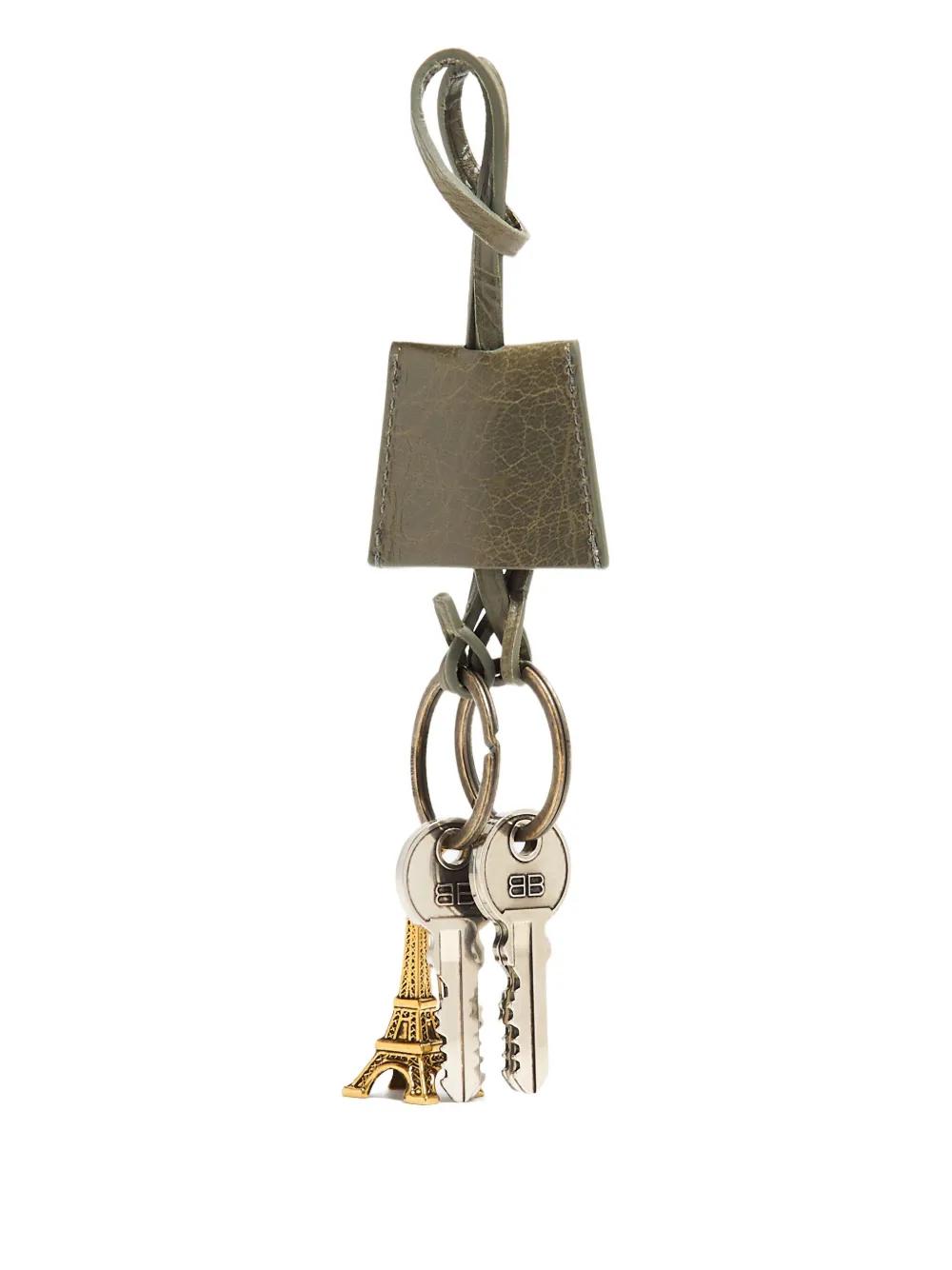 green leather pouch metal studs two keys Eiffel Tower charm keyring