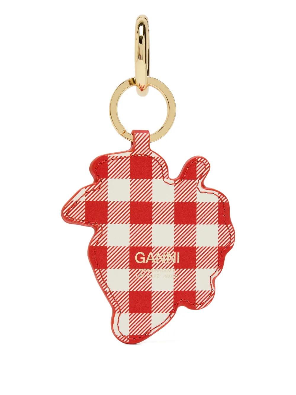 red gingham pattern embroidered grape motif gold-tone keyring