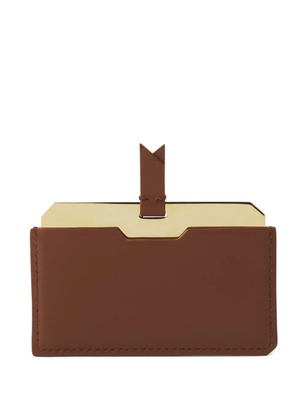 brown leather construction gold-tone metal detail stitched edges leather tag