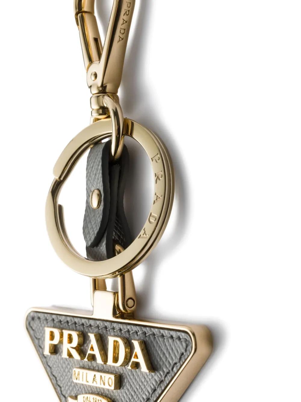 gold-tone and grey snap-hook ring metal lettering logo saffiano leather triangle logo