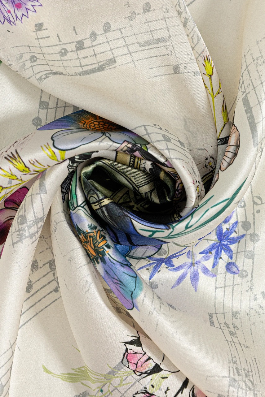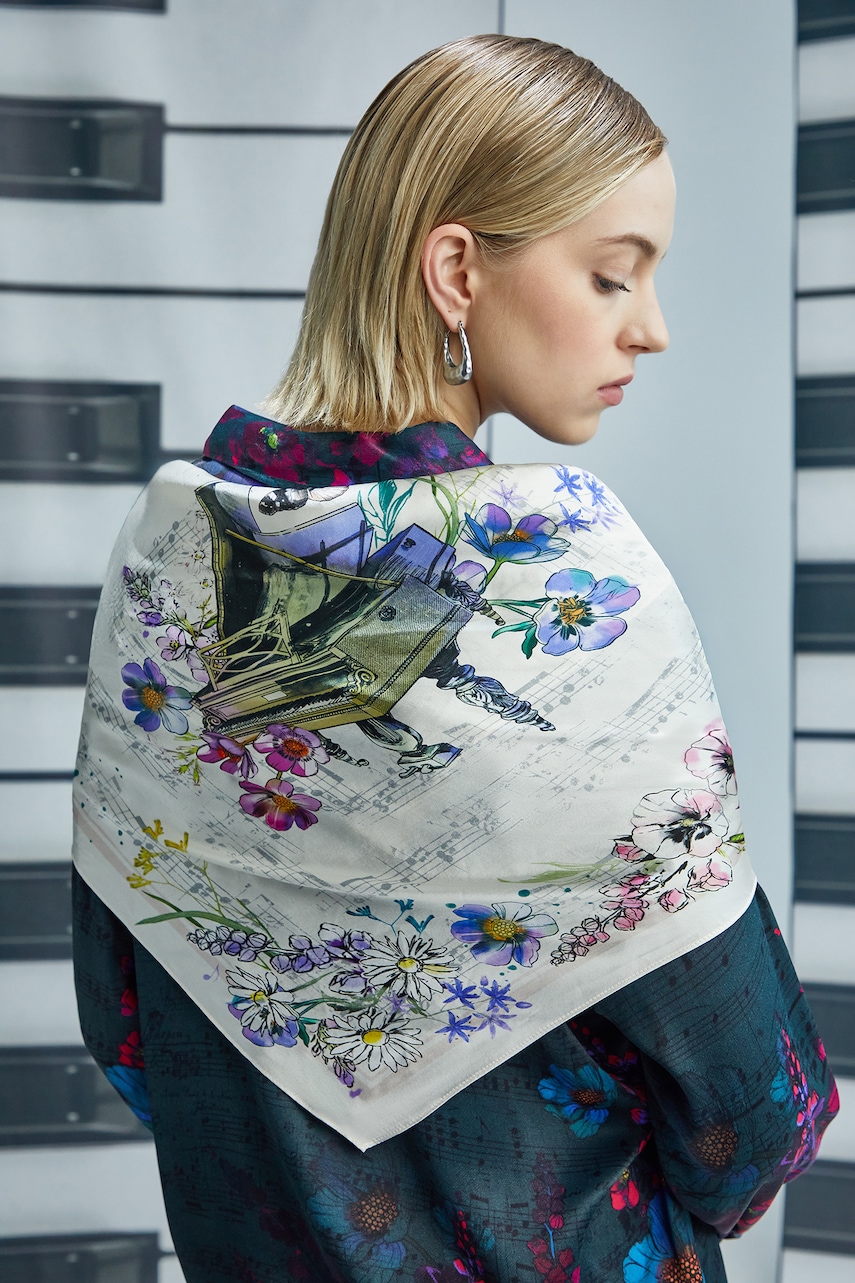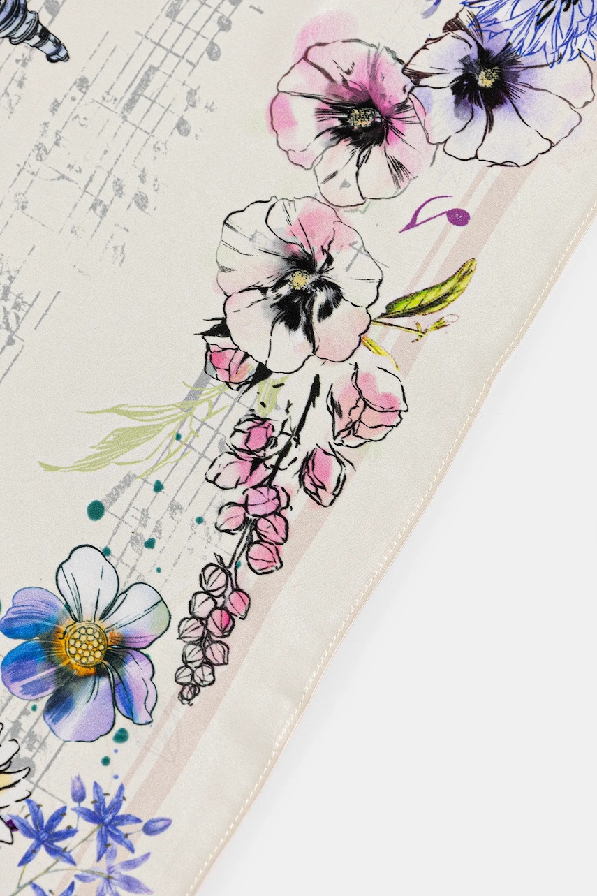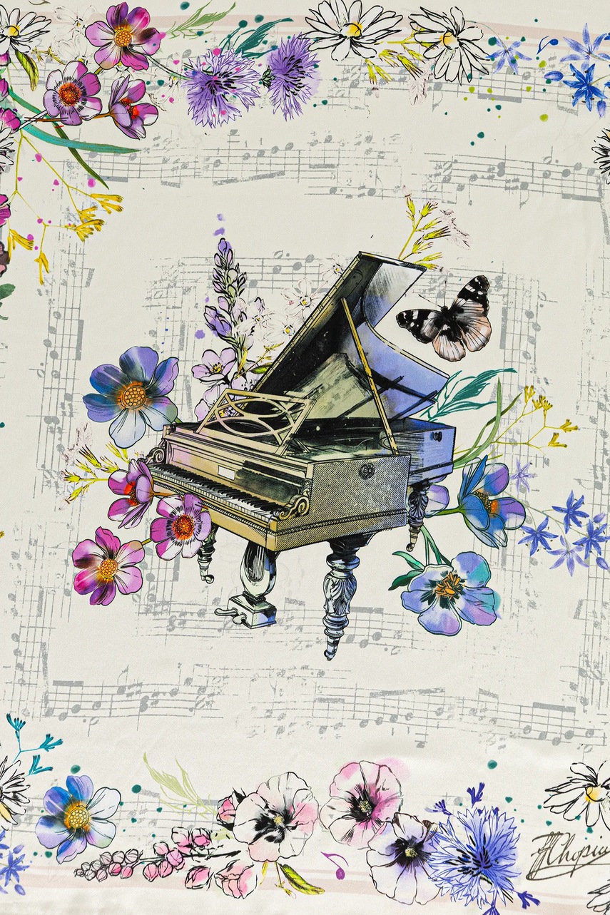 Kolekcja Narodowy Instytut Fryderyka Chopina x Medicine łączy w sobie modę i sztukę, przenosząc romantyczną wrażliwość do współczesnej garderoby. To hołd dla największego polskiego kompozytora i jednego z najwybitniejszych twórców XIX wieku. Na ubraniach i akcesoriach pojawiają się oryginalne fragmenty zapisów nutowych, podpis, cytaty, wizerunek Fryderyka Chopina oraz grafiki stworzone pod wpływem jego muzyki. Romantyzm, którego Chopin był jednym z najważniejszych przedstawicieli, to czas, w którym emocje, indywidualizm i duchowość odgrywały kluczową rolę. W kolekcji wyrażone zostały poprzez miękkie linie, subtelne barwy nawiązujące do epoki oraz motywy inspirowane naturą i sztuką – obecne zarówno na odzieży damskiej, męskiej, jak i akcesoriach. To propozycja dla osób, które w modzie poszukują sztuki, głębi i nieoczywistych inspiracji. Kolekcja powstała w ścisłej współpracy z Narodowym Instytutem Fryderyka Chopina, co podkreśla jej autentyczność i szacunek do dziedzictwa kulturowego. W części projektów wykorzystano także prace prezentowane na wystawie „Romantyczny Chopin” w Art Box Experience. - Wzorzysta, jedwabna tkanina. - Wymiary: 64 x 64 cm.