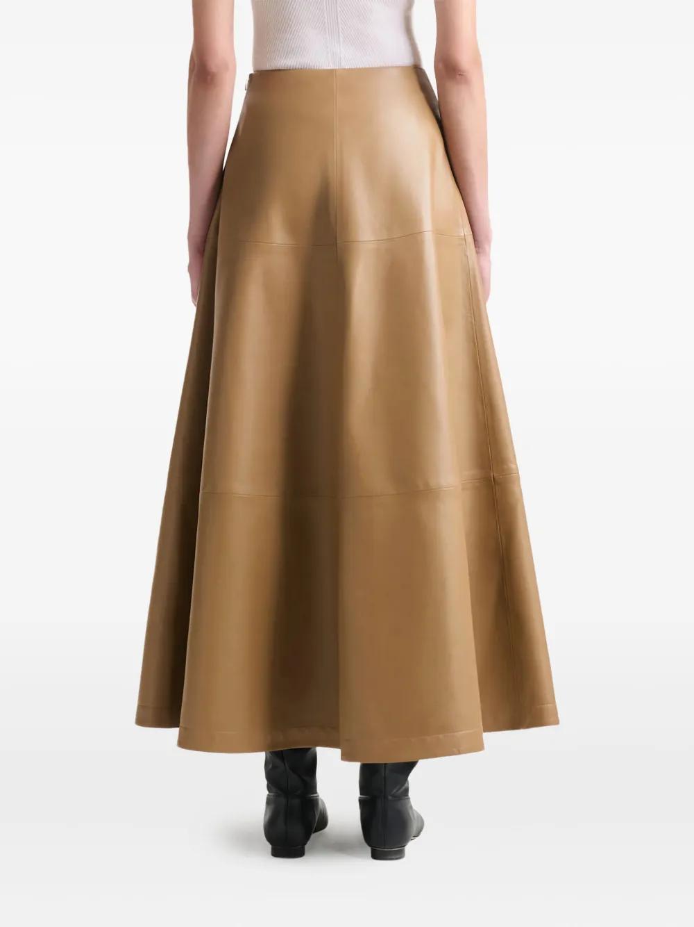 saddle brown leather high waist side zip fastening front pleat detail A-line shape