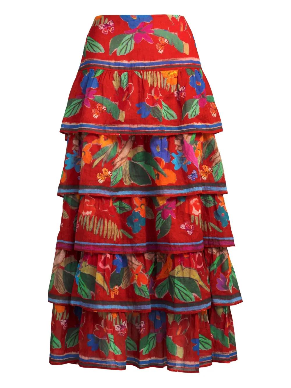 bright red floral print ruffle design contrasting trim elasticated waistband