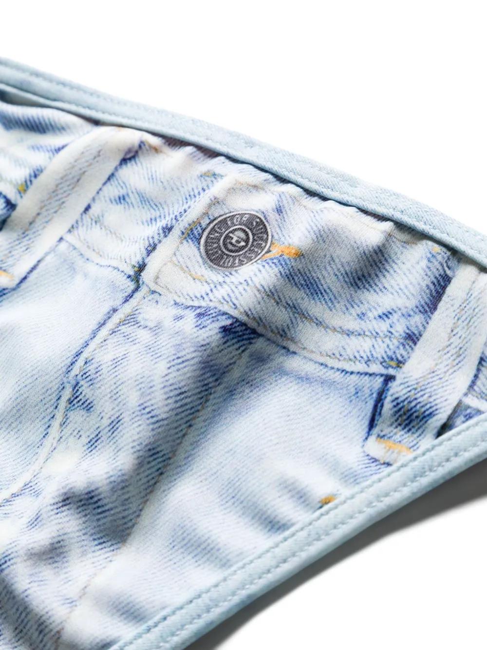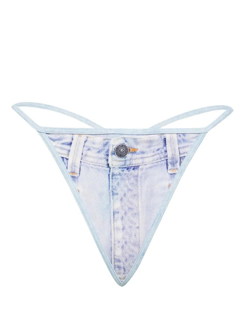 light blue stretch-design Oval D logo plaque denim print to the front low-rise thong style silver-tone hardware Be mindful to try on swimwear over your own garments.