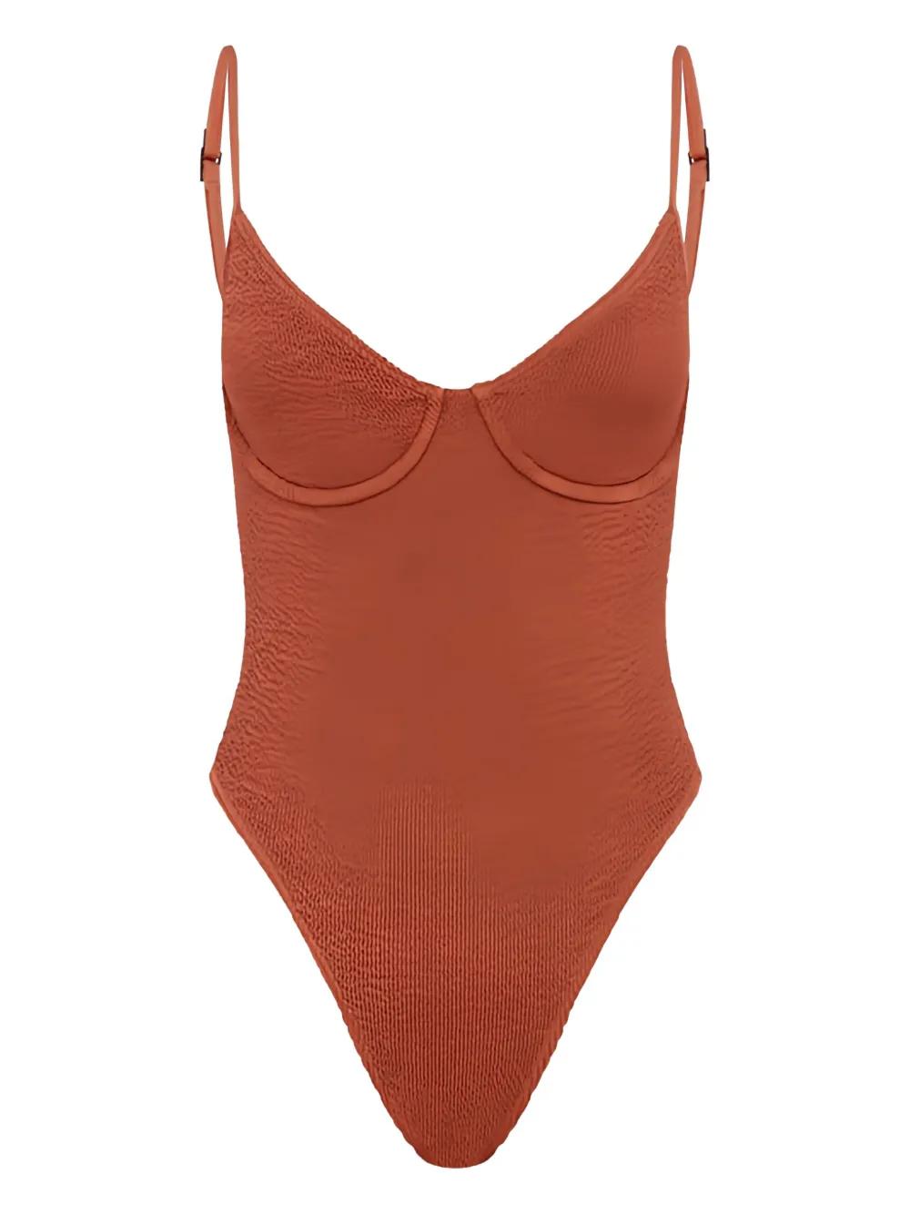 brown textured finish adjustable straps underwired cups low back Be mindful to try on swimwear over your own garments.