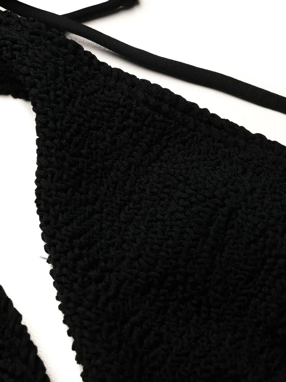 Sofie triangle bikini top from Bond-eye featuring black, recycled polyamide blend, crinkled finish, triangle cup, halterneck tie fastening and rear tie fastening. Be mindful to try on swimwear over your own garments.. .