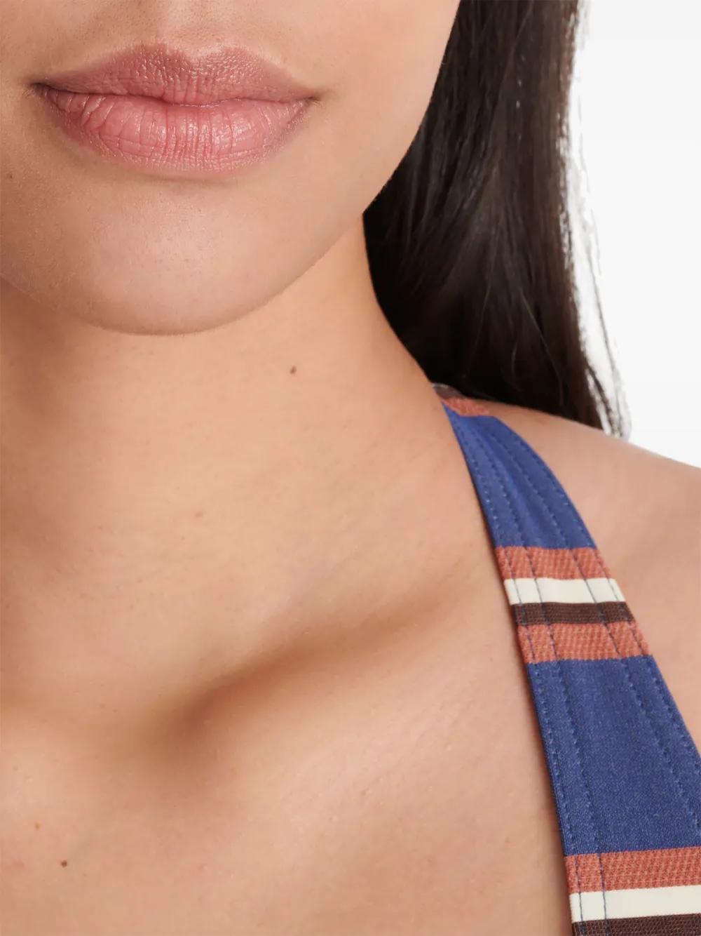 blue halterneck tie fastening front tie fastening rear clasp fastening Be mindful to try on swimwear over your own garments.