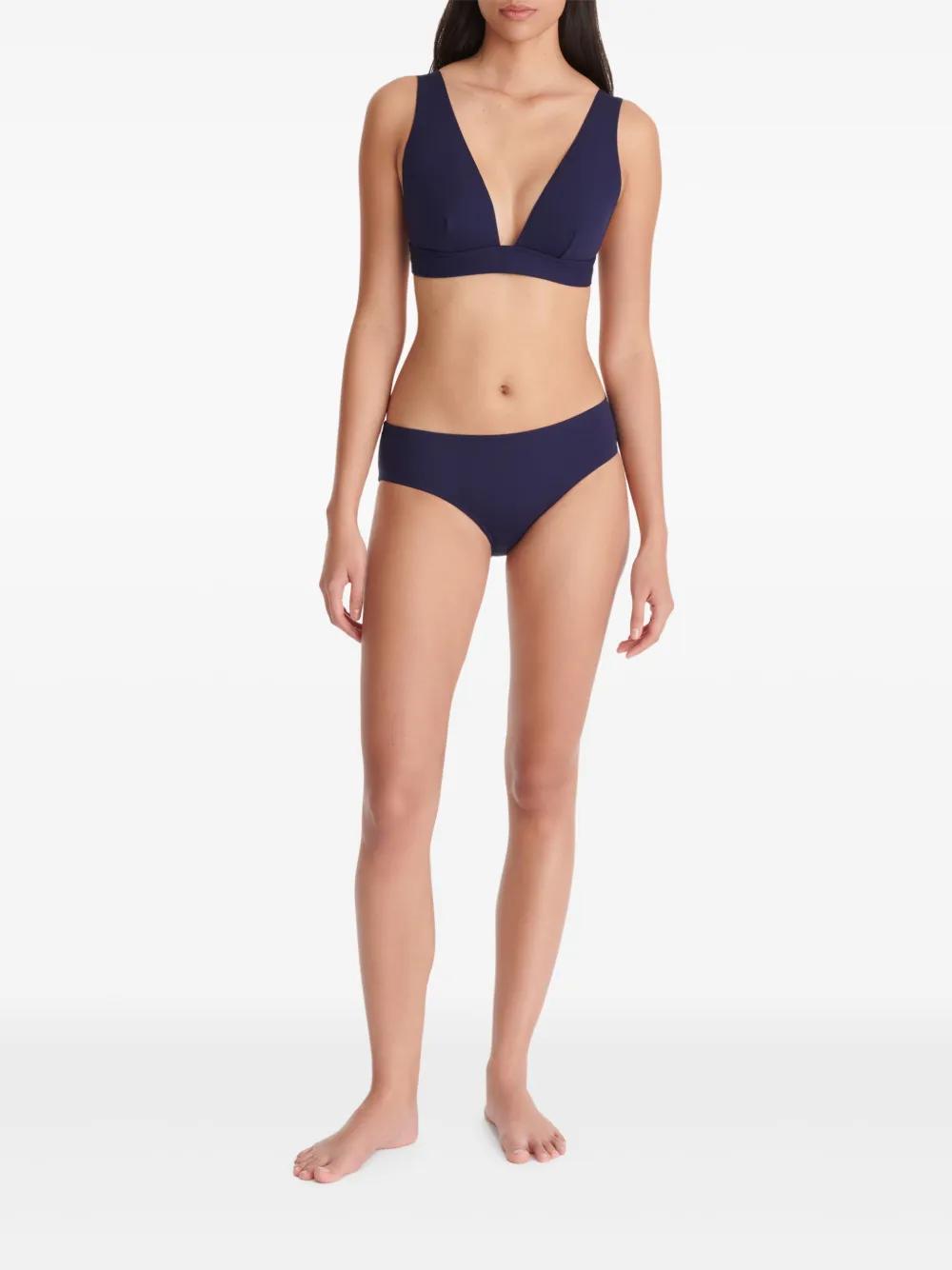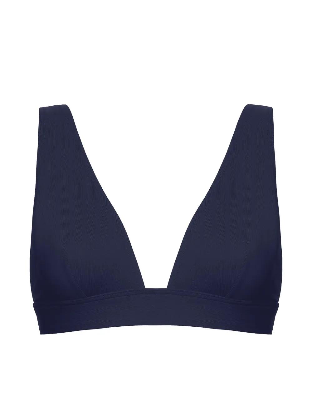 navy blue stretch-design wide shoulder straps triangle cup square open back rear clasp fastening Be mindful to try on swimwear over your own garments.