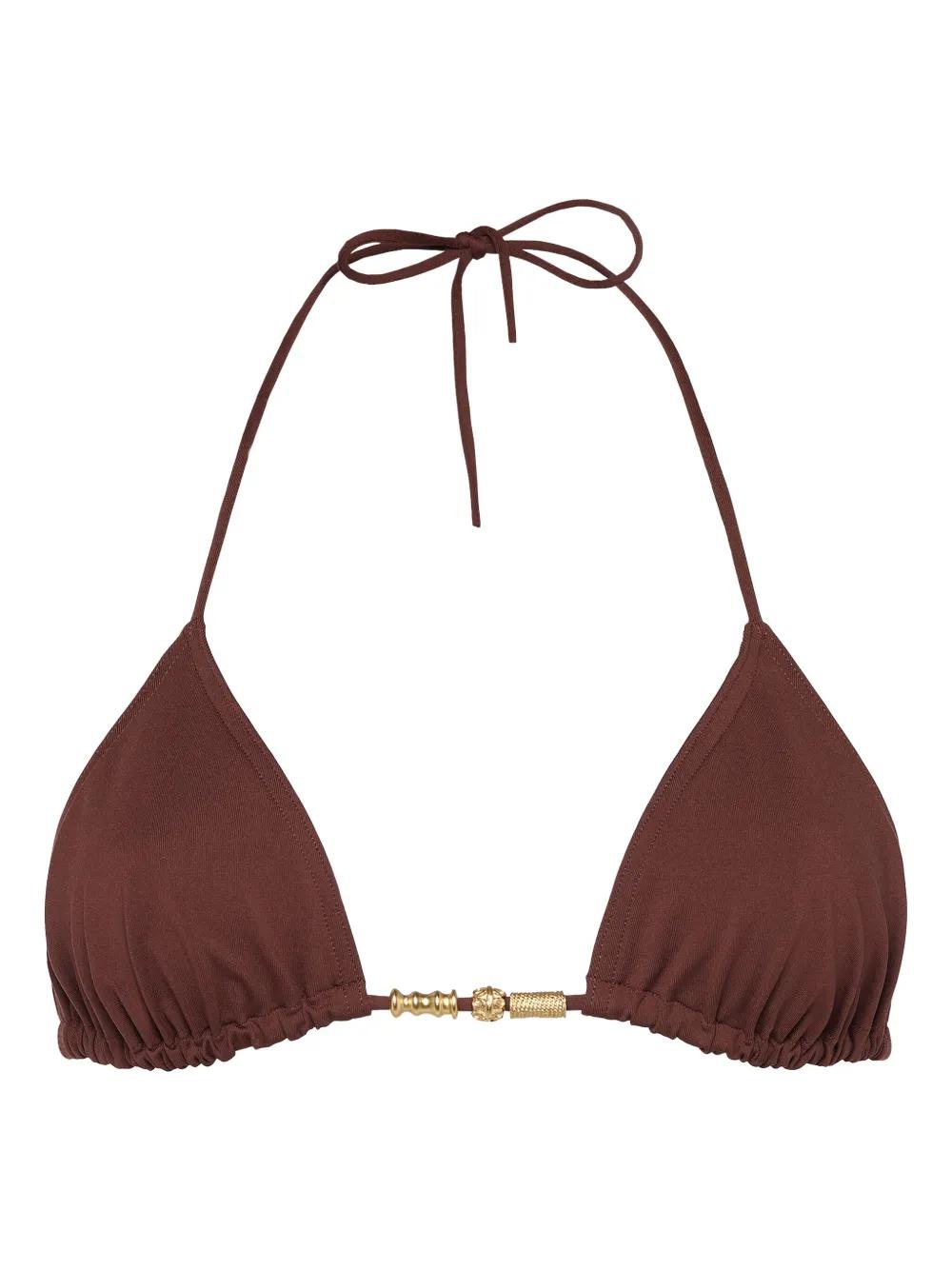 brown triangle cup halterneck tie fastening rear tie fastening Be mindful to try on swimwear over your own garments.