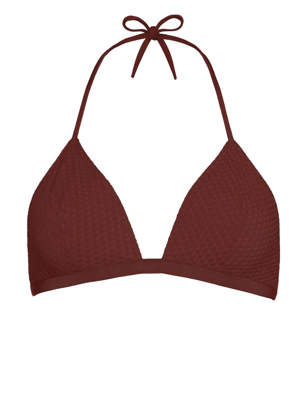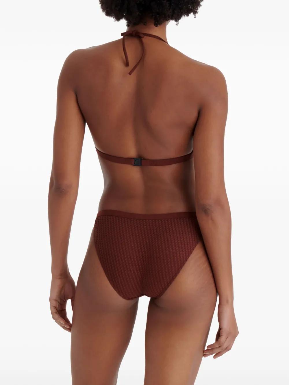 brown clasp fastening halterneck tie fastening triangle cup Be mindful to try on swimwear over your own garments.