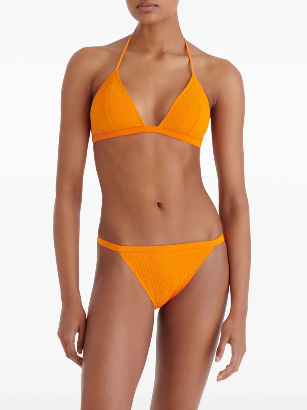 orange self-tie fastening triangle cup Be mindful to try on swimwear over your own garments.