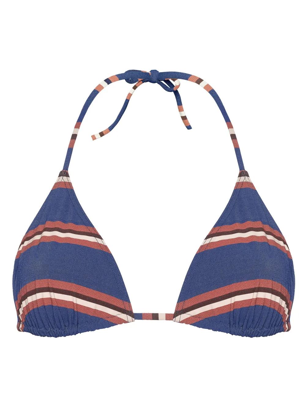 blue rear tie fastening horizontal stripe pattern triangle cup Be mindful to try on swimwear over your own garments.