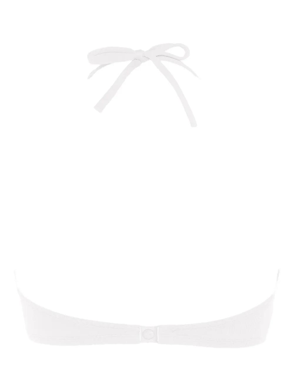 white halterneck clasp fastening triangle cups bow detail tonal stitching Be mindful to try on swimwear over your own garments.