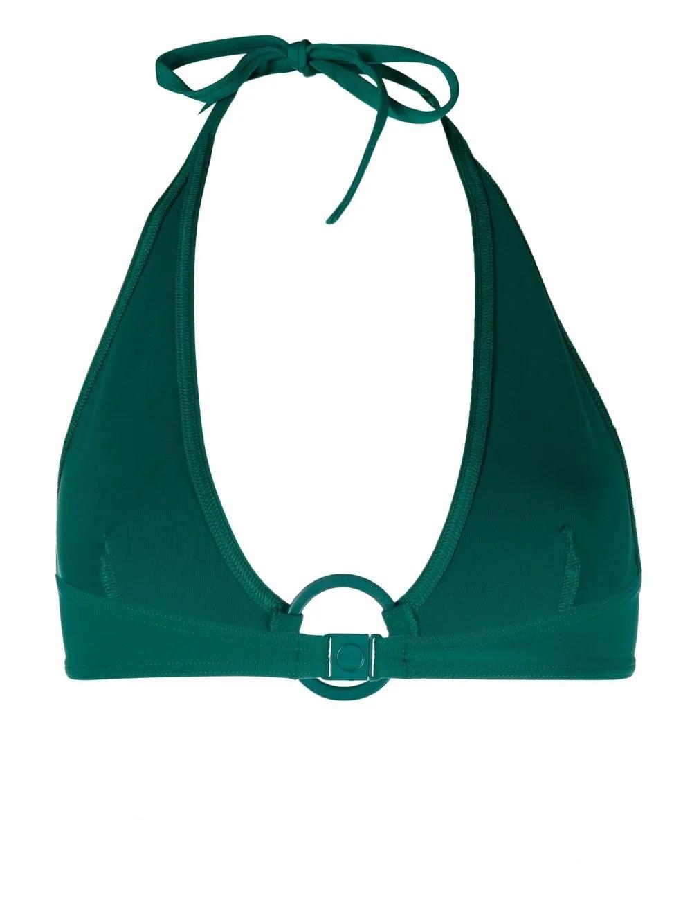 forest green stretch-design triangle cup halterneck tie fastening ring hardware detailing Be mindful to try on swimwear over your own garments.