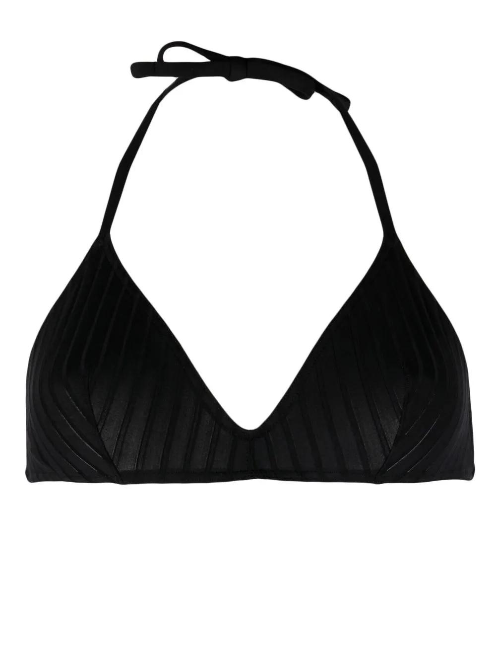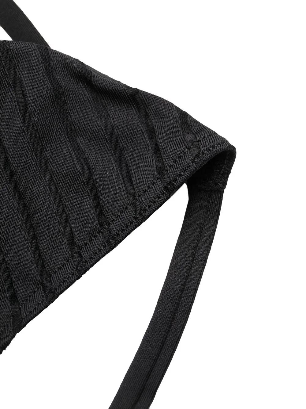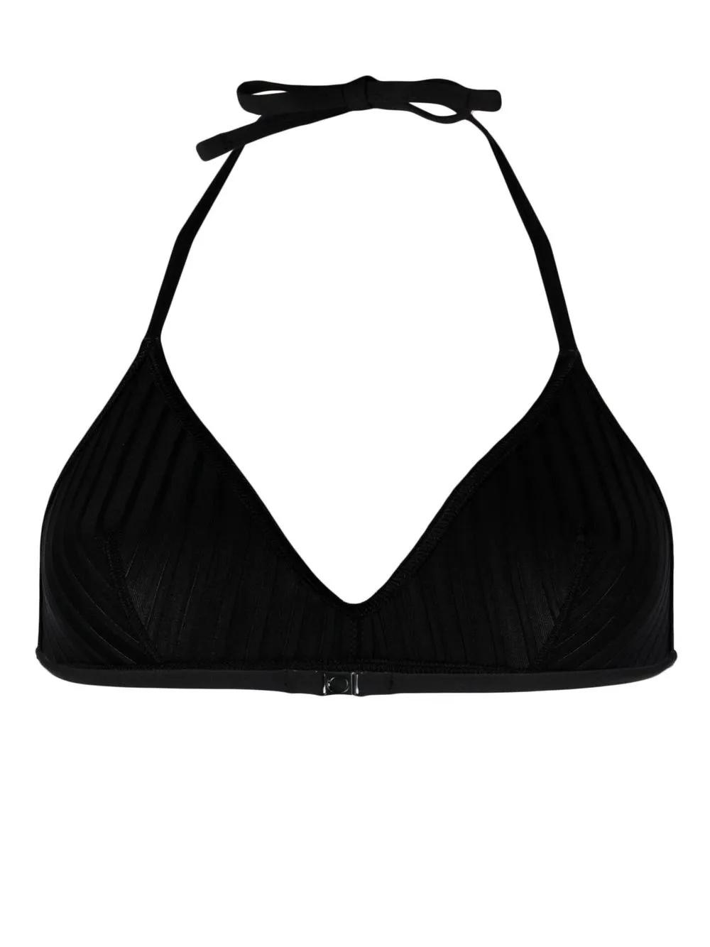 black ribbed detailing triangle cup halterneck tie fastening rear clasp fastening Be mindful to try on swimwear over your own garments.