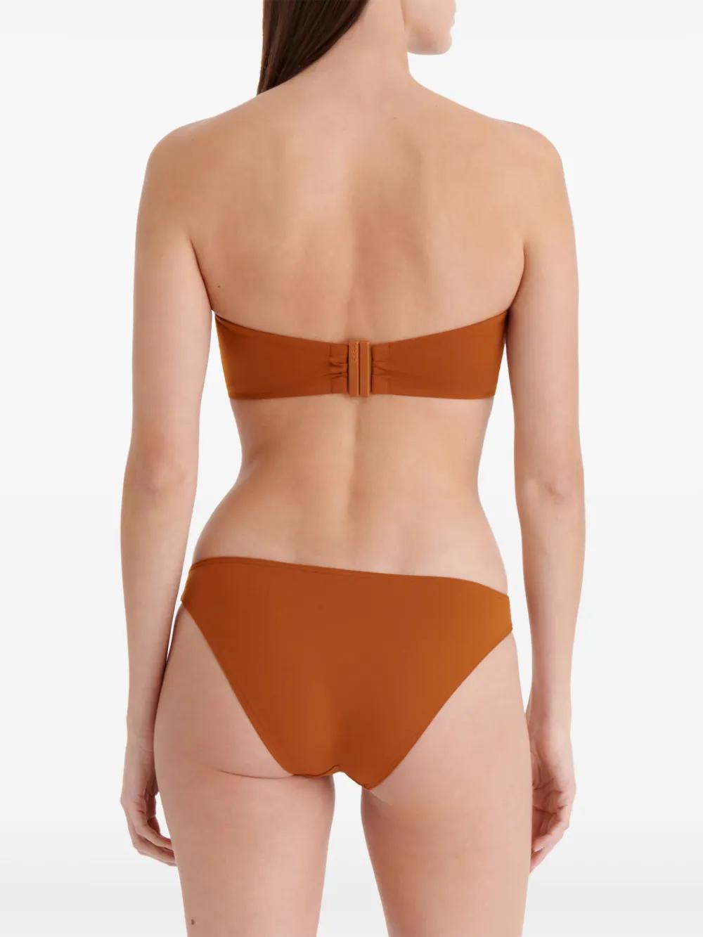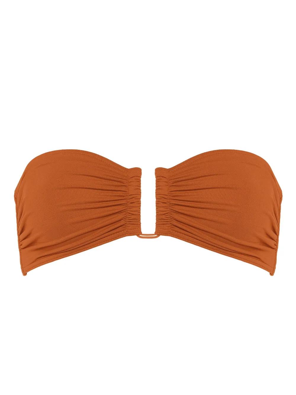 brown rear clasp fastening bandeau style Be mindful to try on swimwear over your own garments.