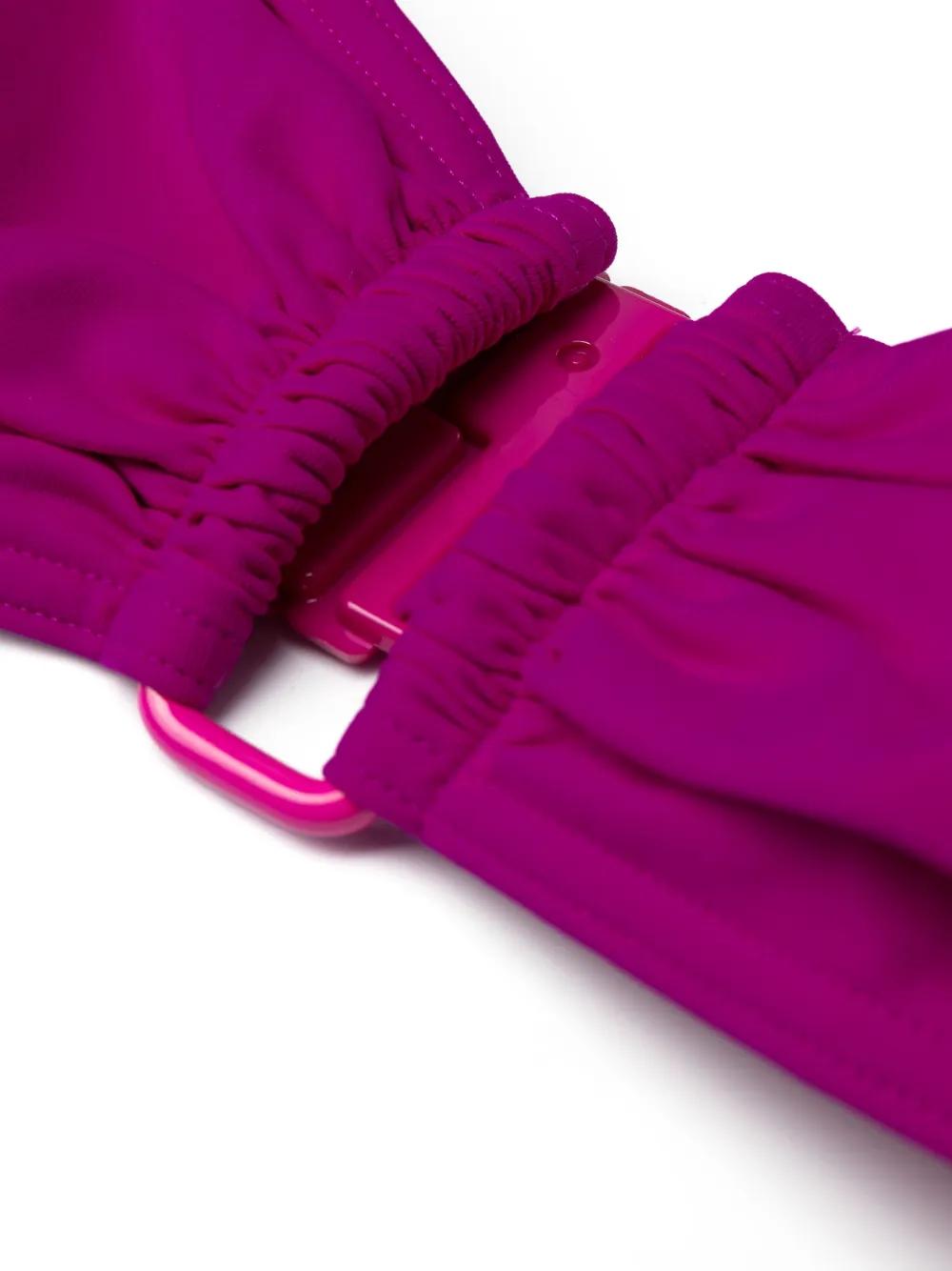dark magenta stretch-design bandeau style shirred detail ring hardware detailing rear clasp fastening Be mindful to try on swimwear over your own garments.