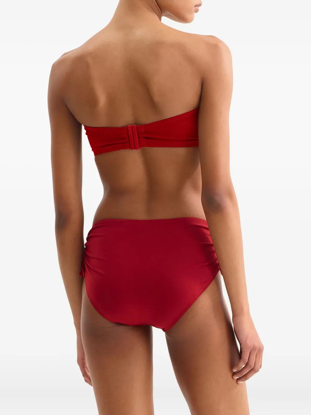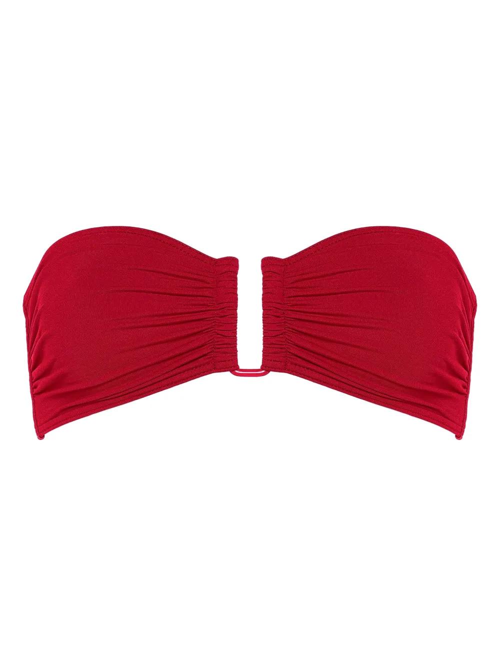 red bandeau neckline gathered fabric Be mindful to try on swimwear over your own garments.