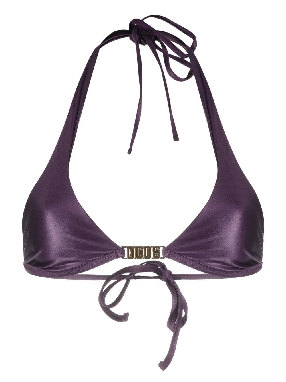 violet purple stretch-design metallic effect gold-tone logo plaque halterneck tie fastening rear tie fastening triangle cup