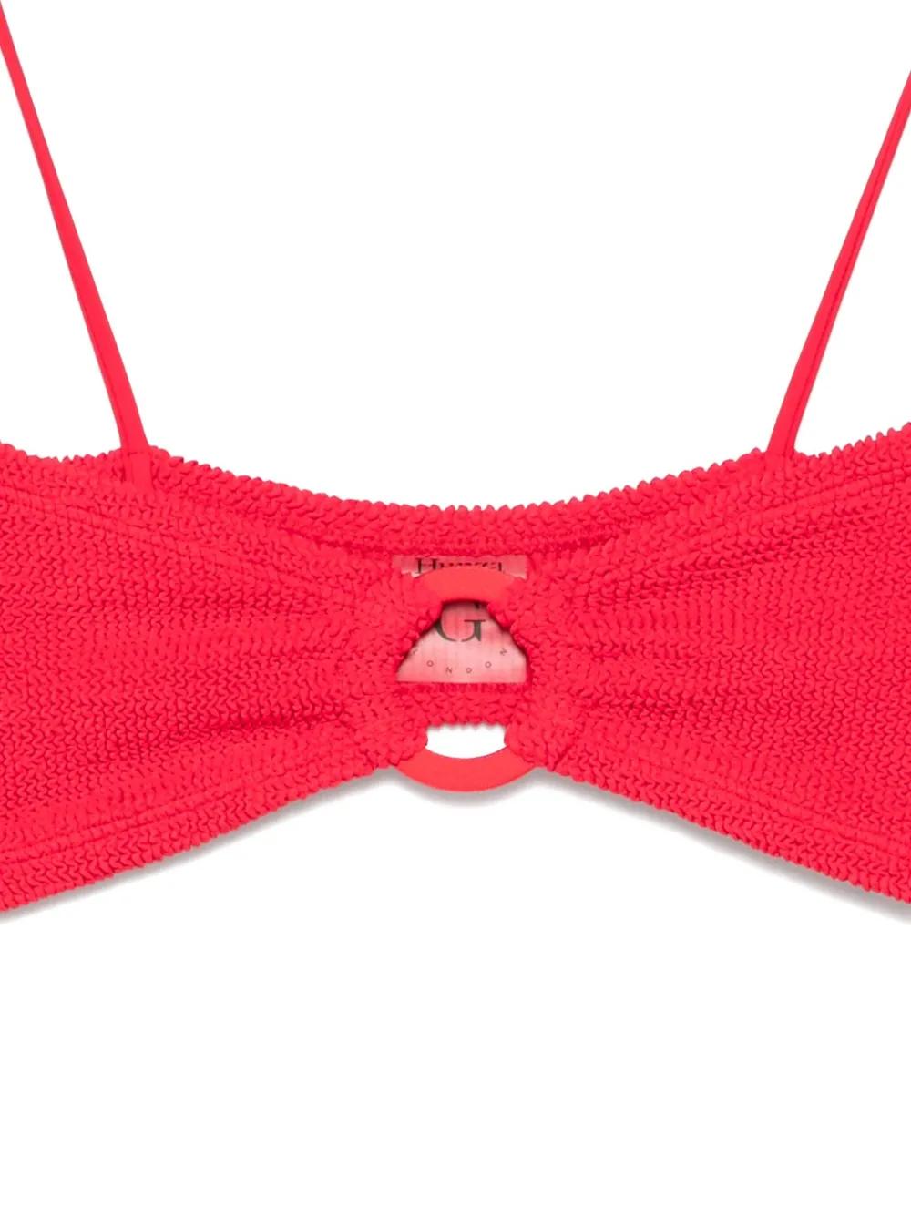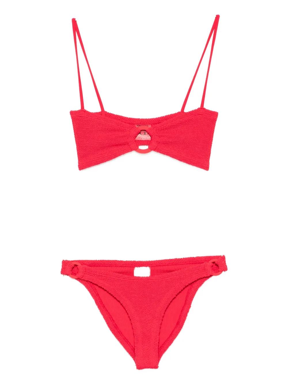 red textured finish hoop details thin straps Be mindful to try on swimwear over your own garments.