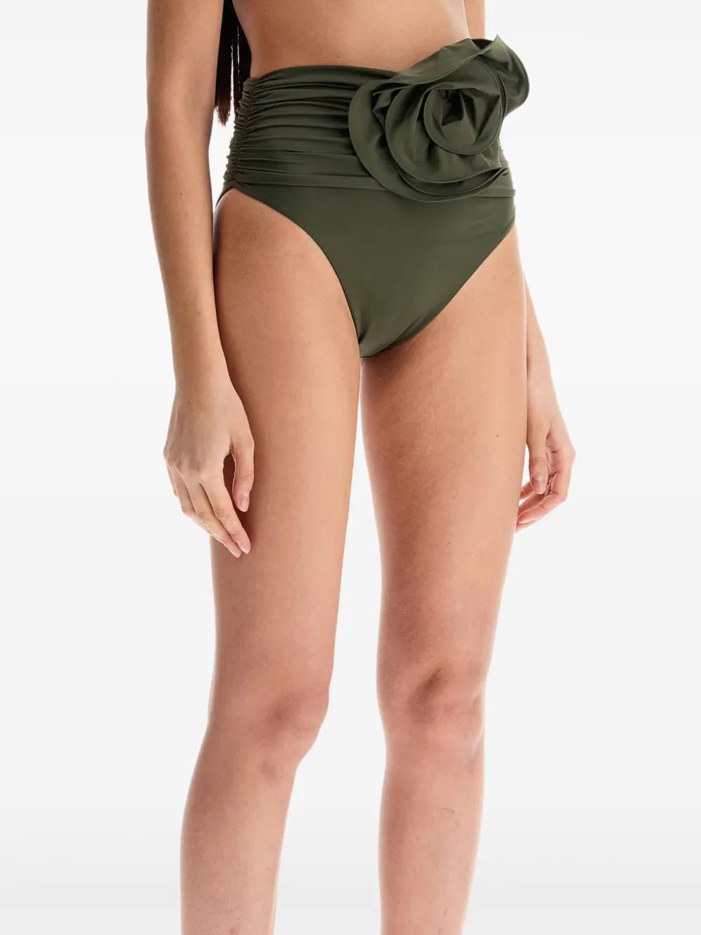 olive green rose embellishment high waist gathered detailing ruched panel full brief cut Be mindful to try on swimwear over your own garments.
