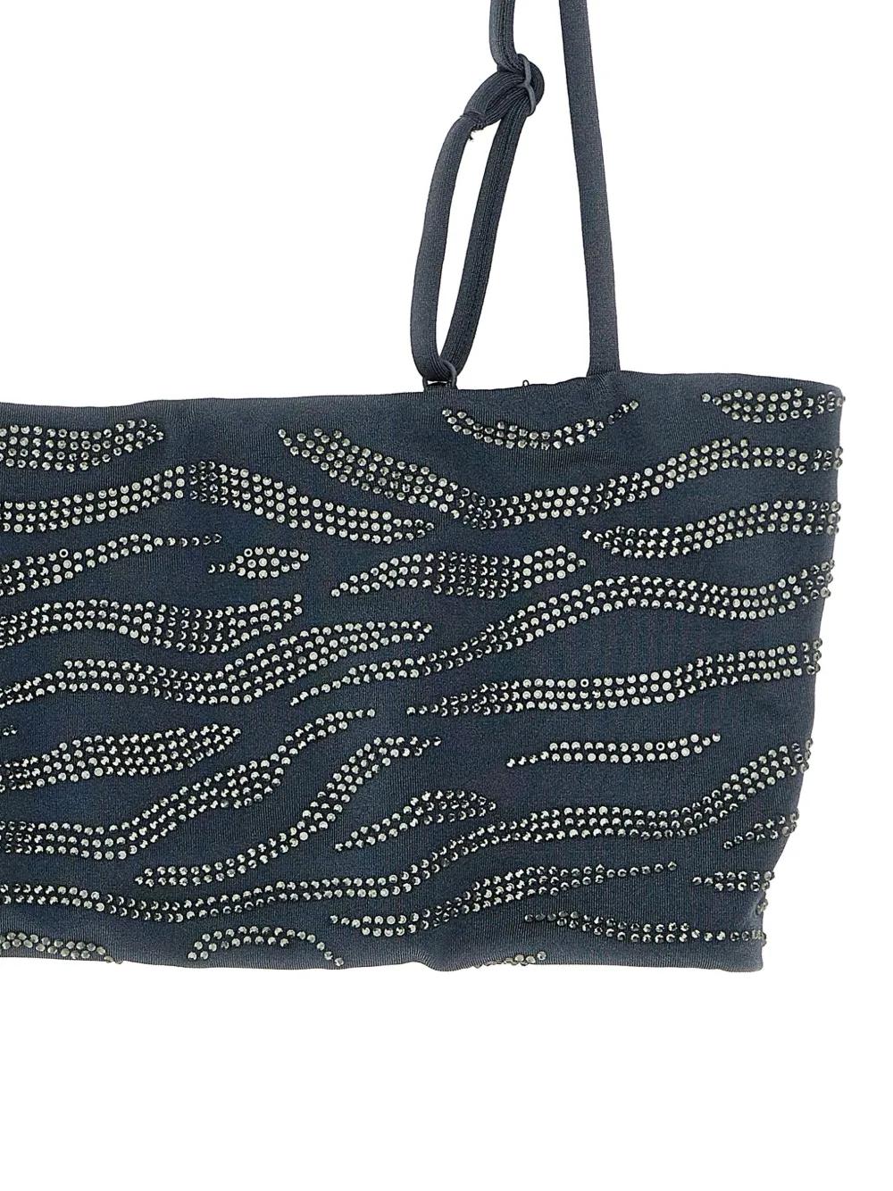 grey zebra pattern rhinestone-appliqué bandeau style thin adjustable straps Be mindful to try on swimwear over your own garments.