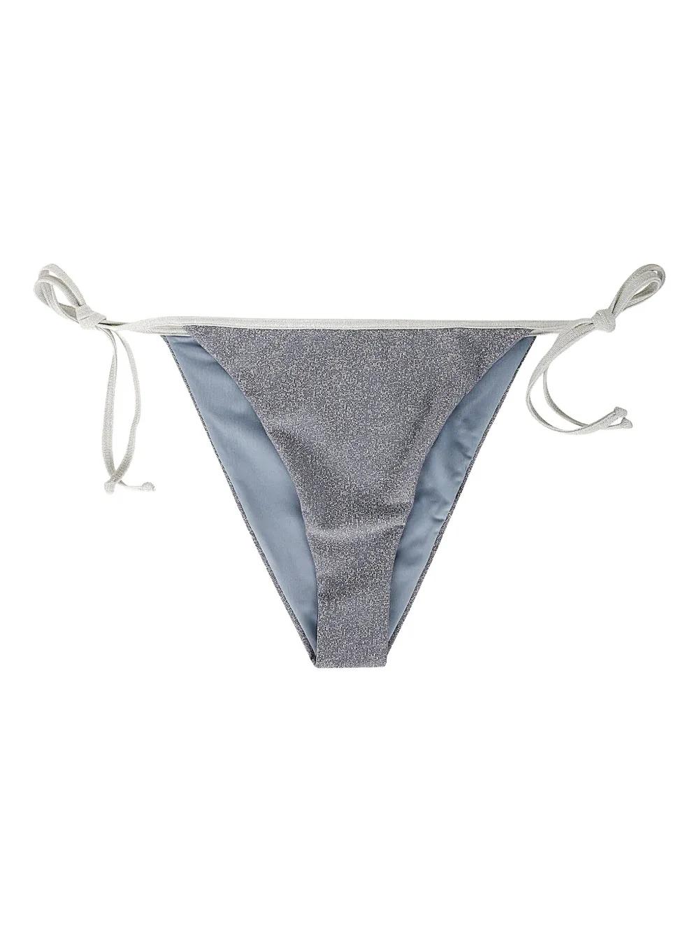 silver lurex fabric glitter finish tie sides Be mindful to try on swimwear over your own garments.