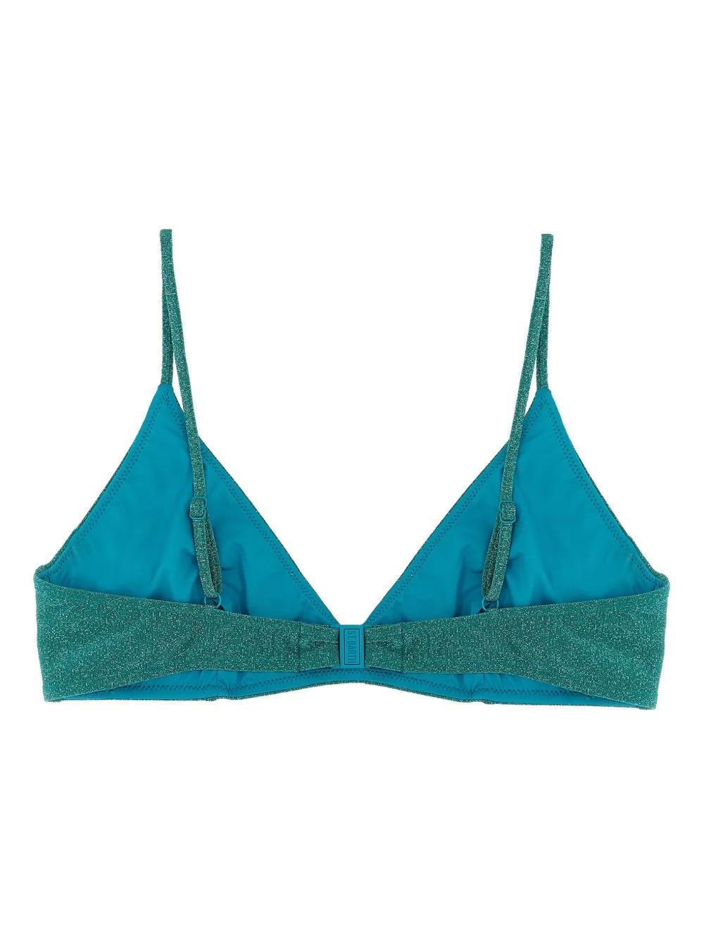 teal green lurex fabric triangle bralette model hook back closure adjustable spaghetti straps glitter effect Be mindful to try on swimwear over your own garments.