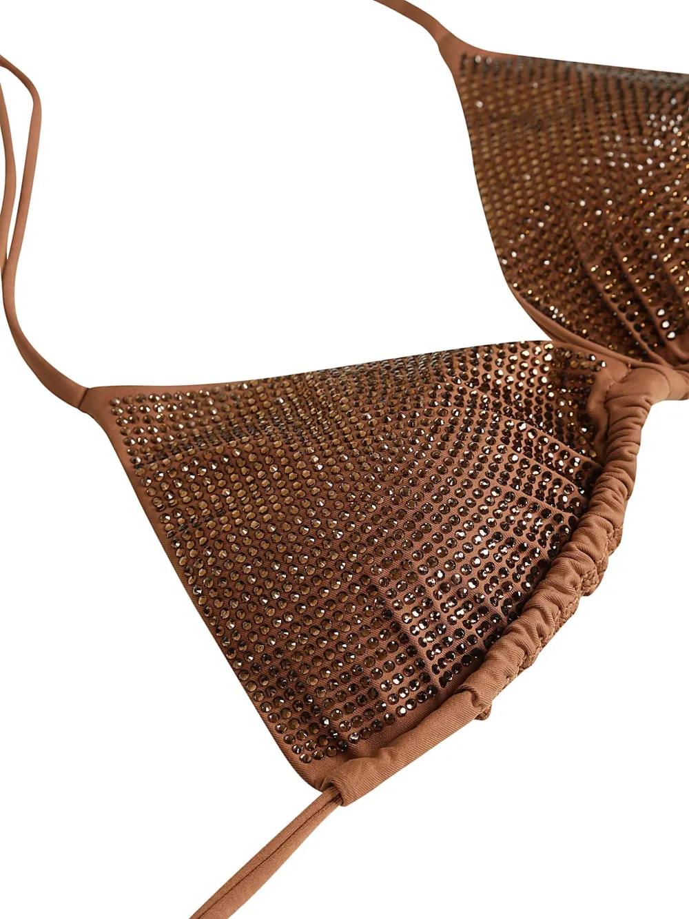 brown sequin embellishment triangle shape lace closure gathered detail halter neck Be mindful to try on swimwear over your own garments.