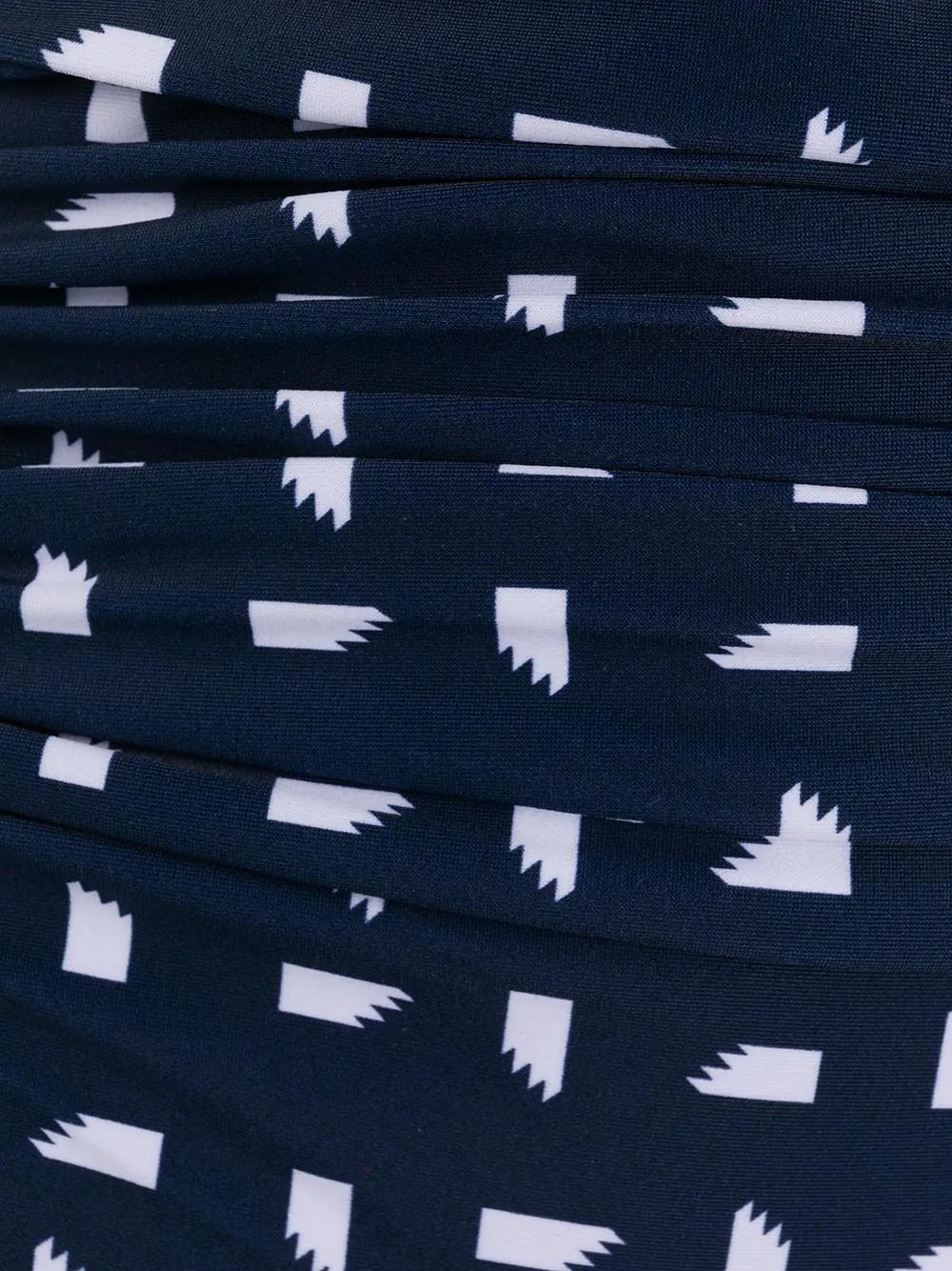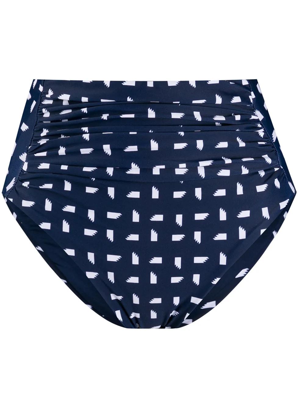 Navy blue and white high-waisted bikini bottoms from Self-Portrait featuring pleated details, a geometric pattern and a pull-on style. Swimwear must be tried on over your own garments.