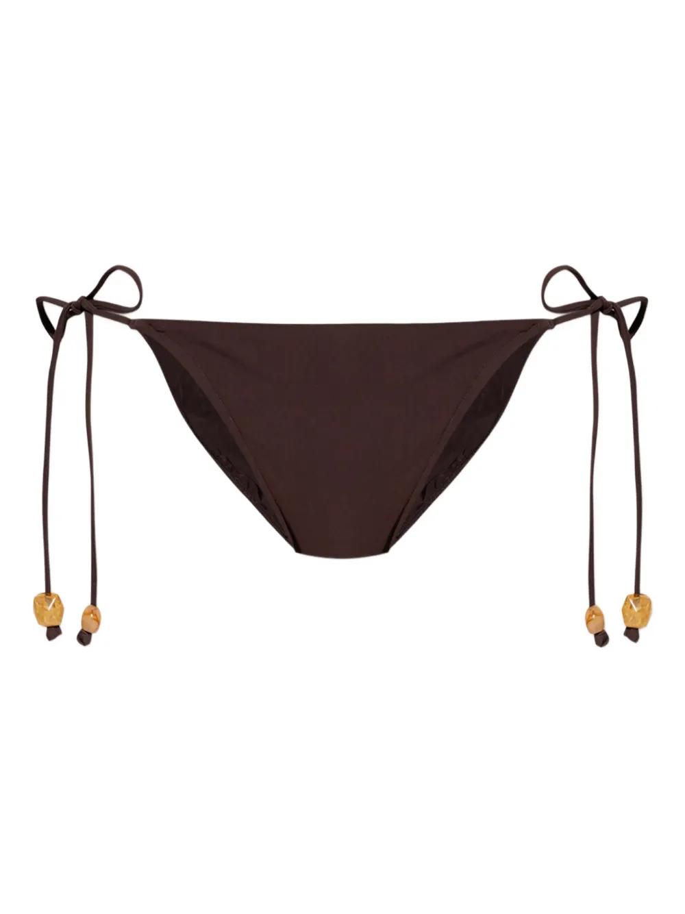 brown side tie fastening bead embellishment Be mindful to try on swimwear over your own garments.
