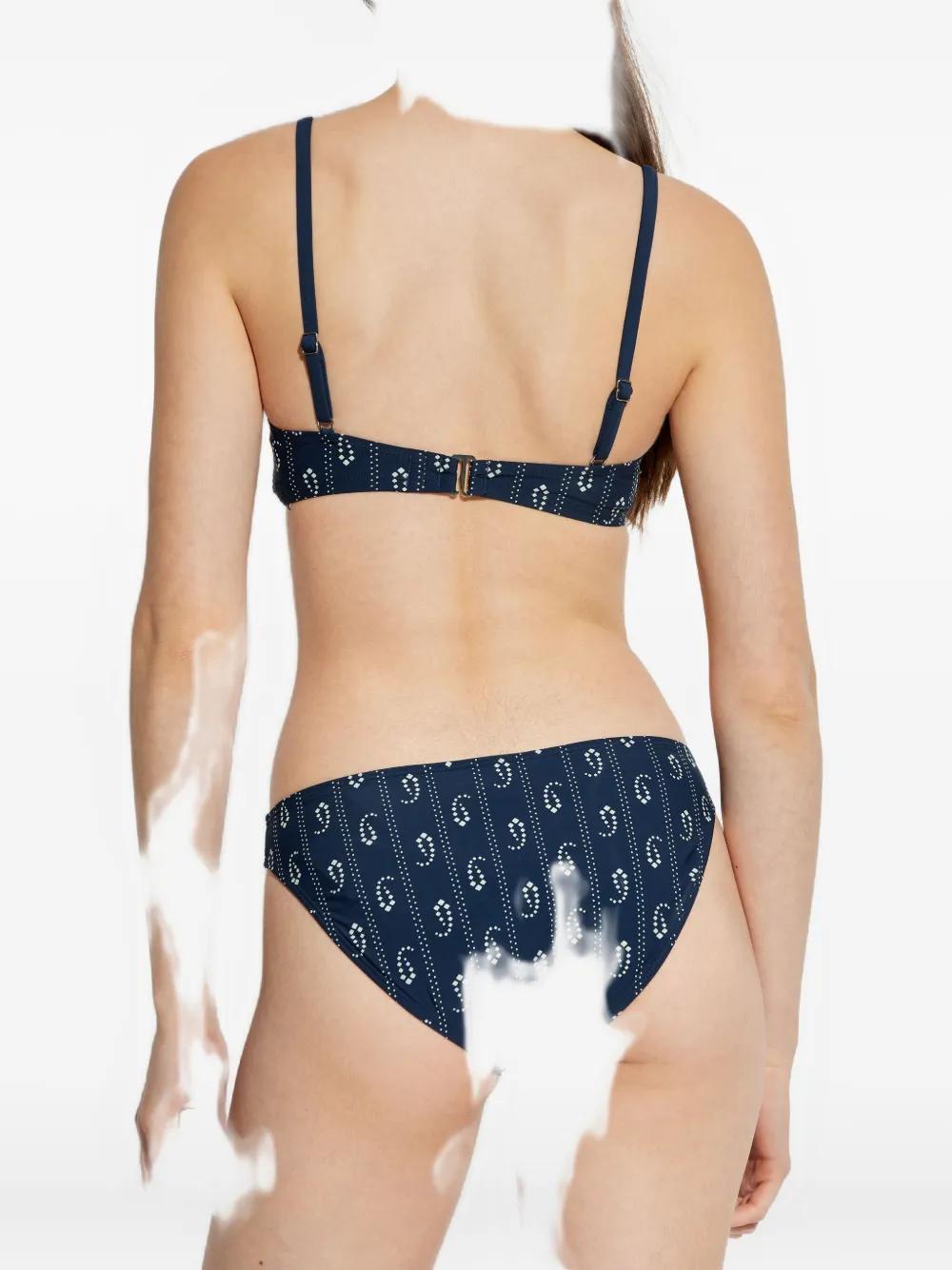 dark blue printed design adjustable straps clasp fastening Be mindful to try on swimwear over your own garments.