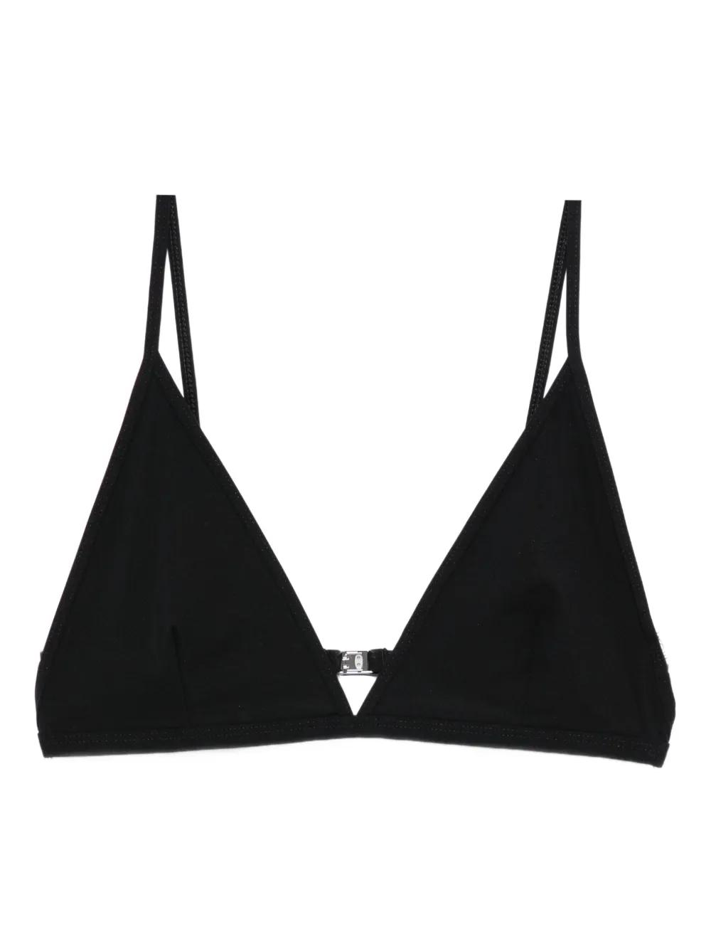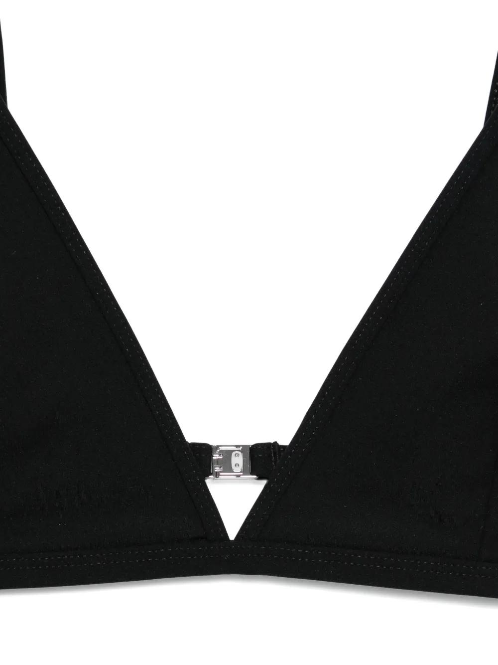 black triangle shape clasp fastening thin straps smooth fabric minimal design Be mindful to try on swimwear over your own garments.