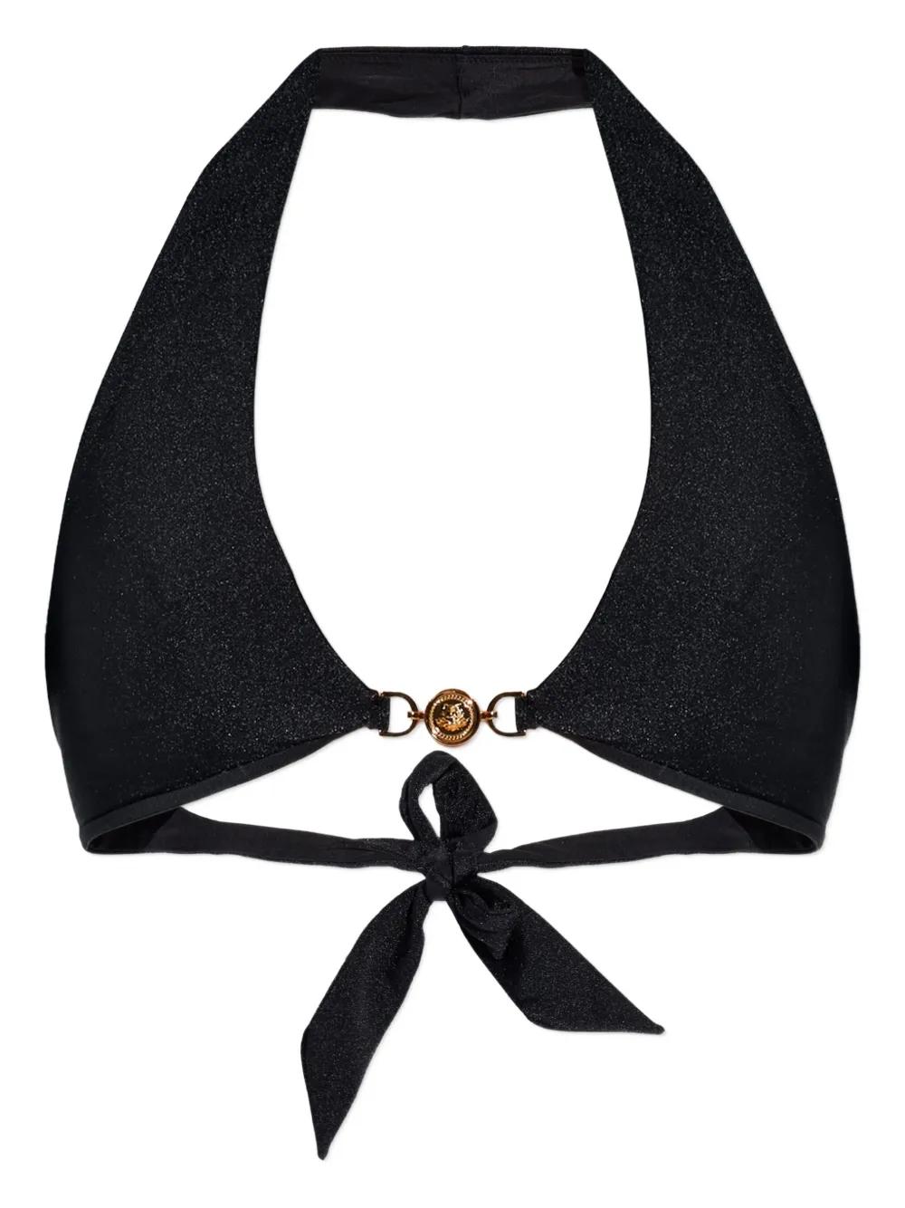 black halterneck medusa detail tie fastening triangle cup string detail Be mindful to try on swimwear over your own garments.