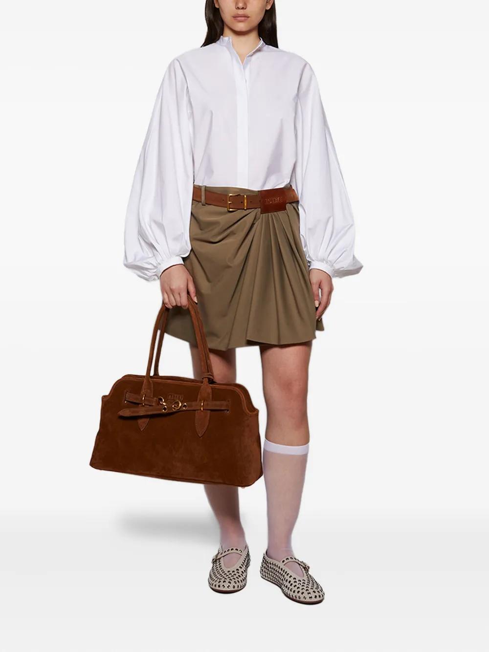 light brown cashmere fabric leather buckle fastening appliqué logo curved peak round crown