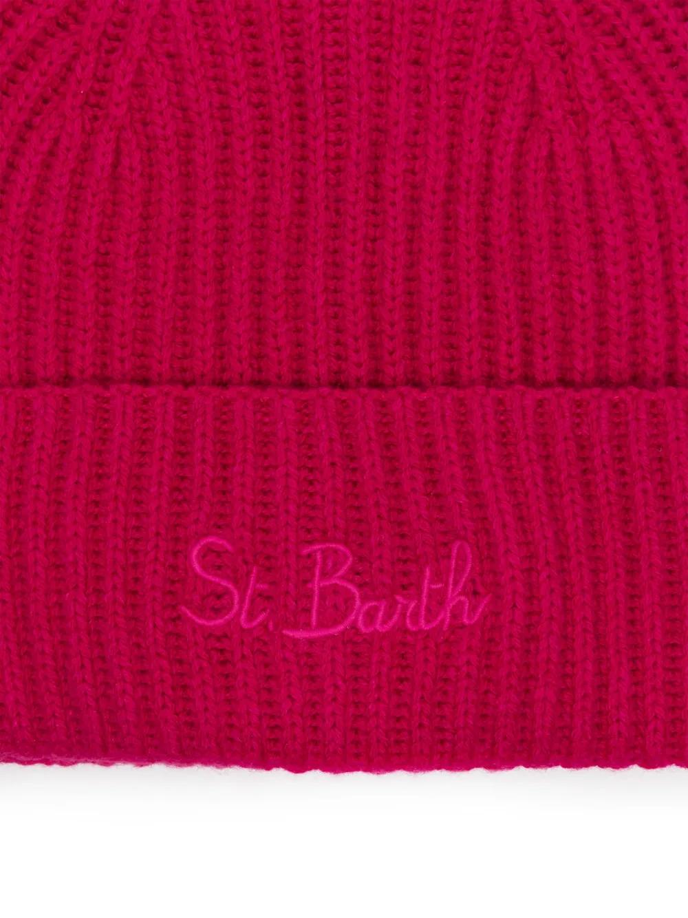 fuchsia pink ribbed knit embroidered logo to the front turn-up hem pull-on style