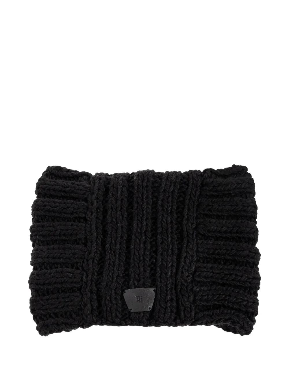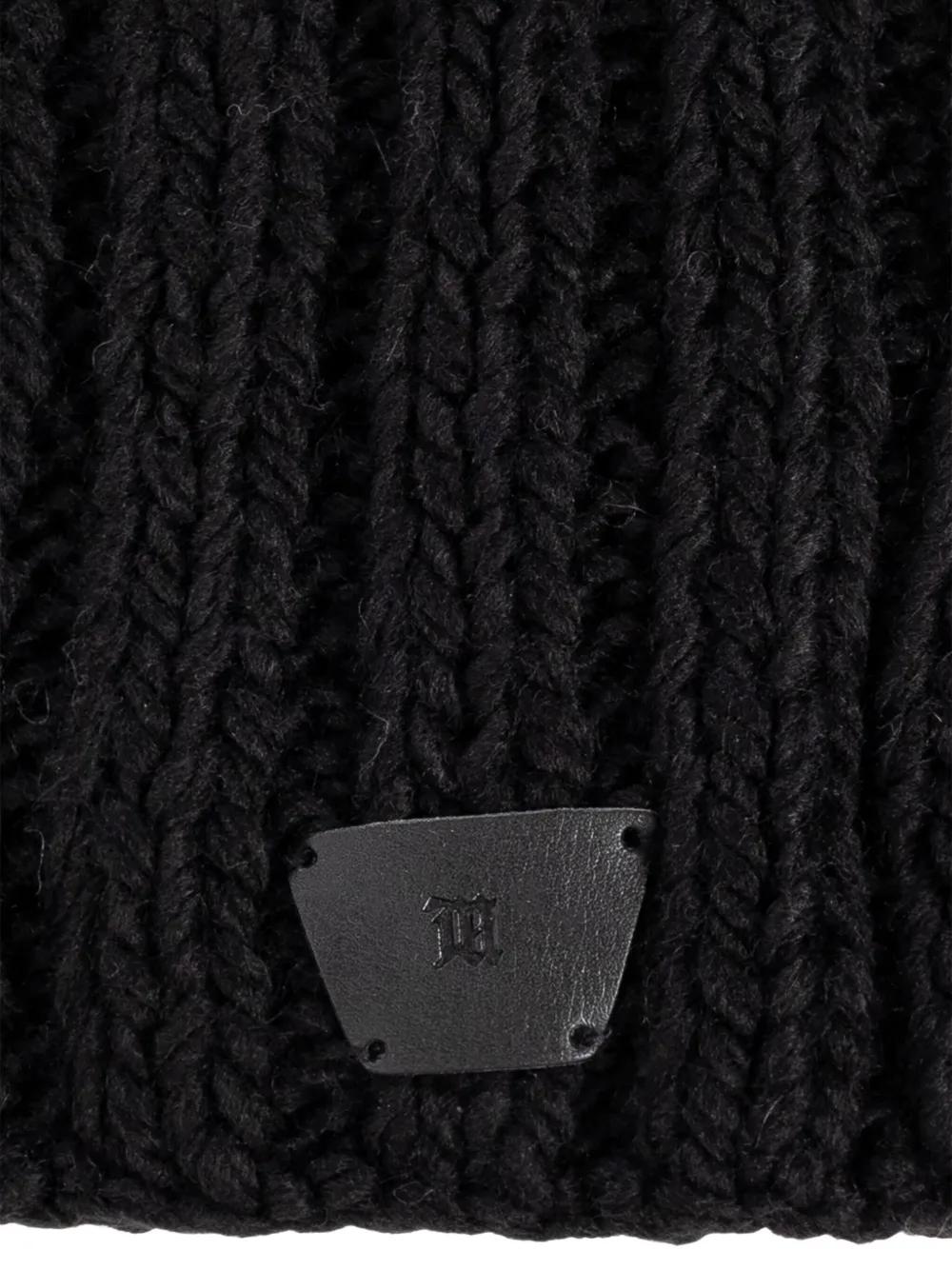 black cable knit ear flaps leather logo patch ribbed texture wide brim