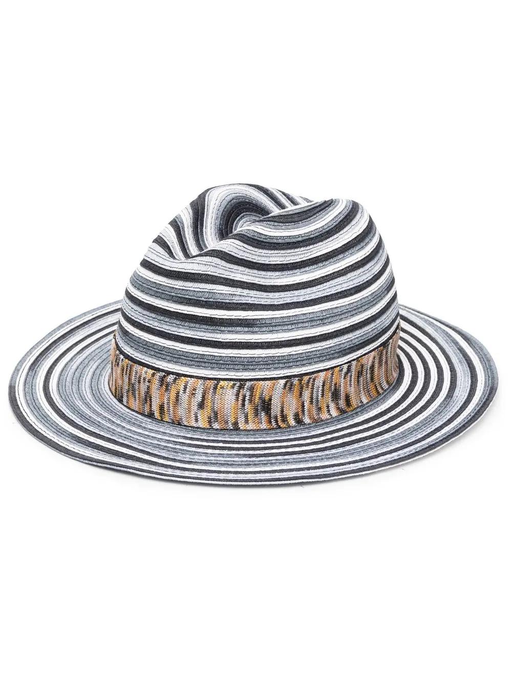 beige/brown cotton-linen blend flat crown dropped wide brim jacquard logo motif gold-tone logo plaque