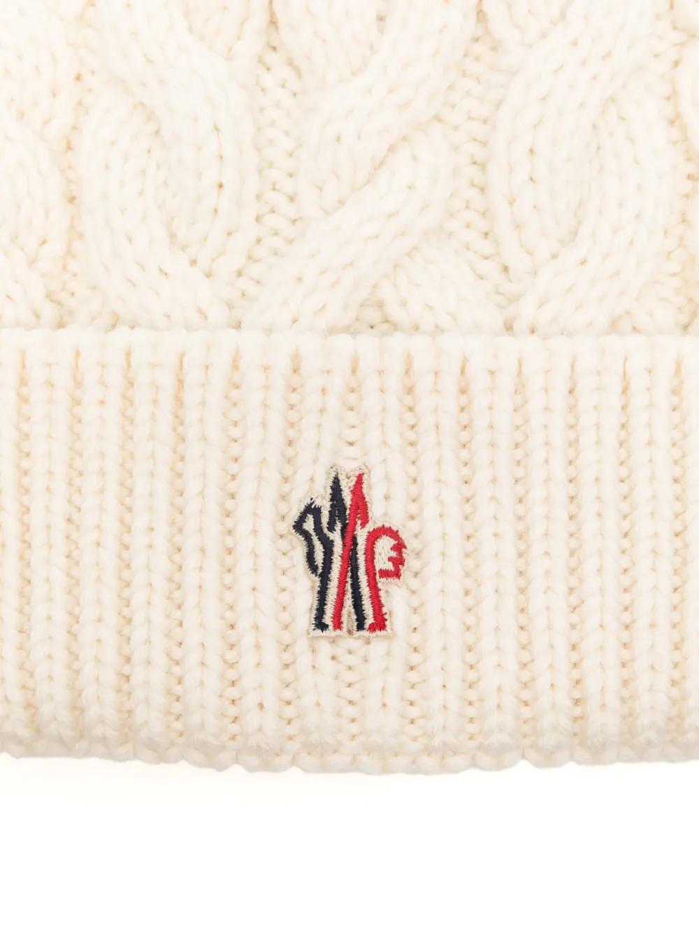 white virgin wool cable knit round crown ribbed panelling turn-up brim embroidered logo to the front unlined