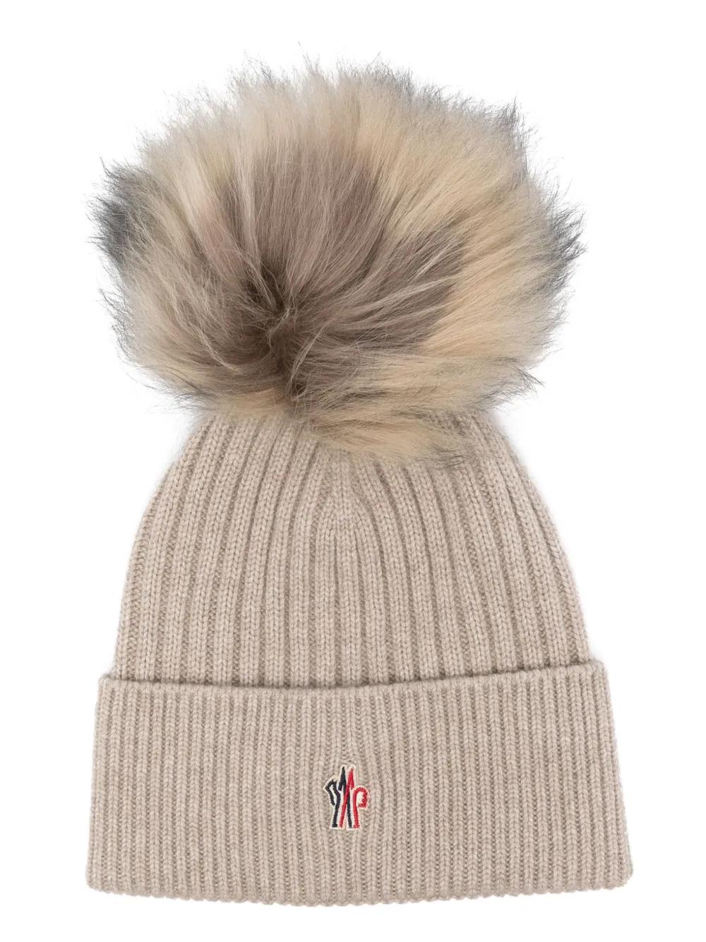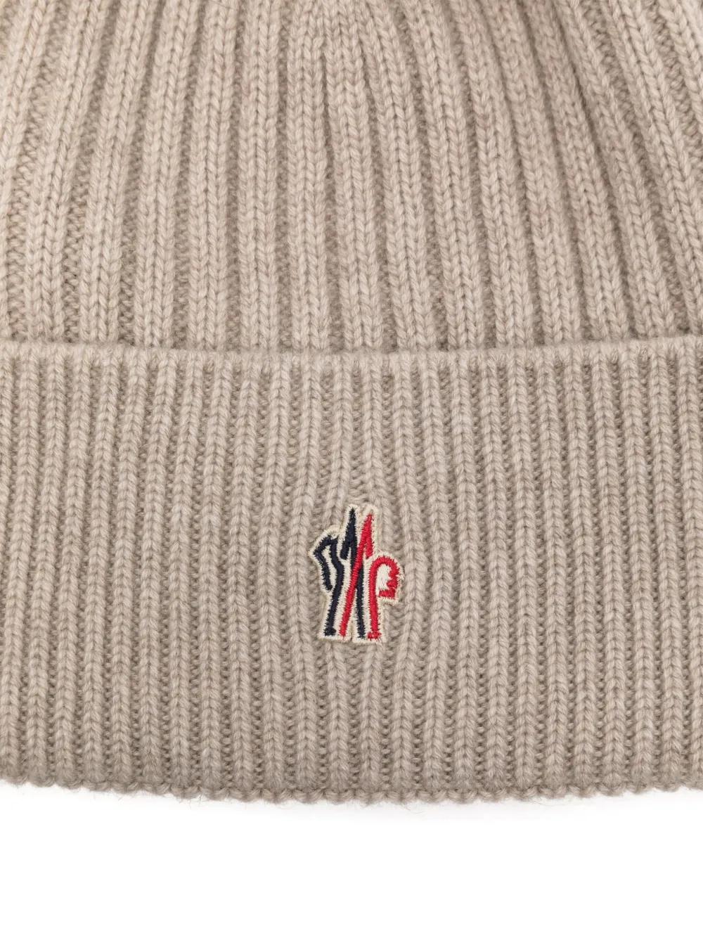 beige cashmere chunky ribbed knit pompom detail logo patch to the front turn-up brim unlined