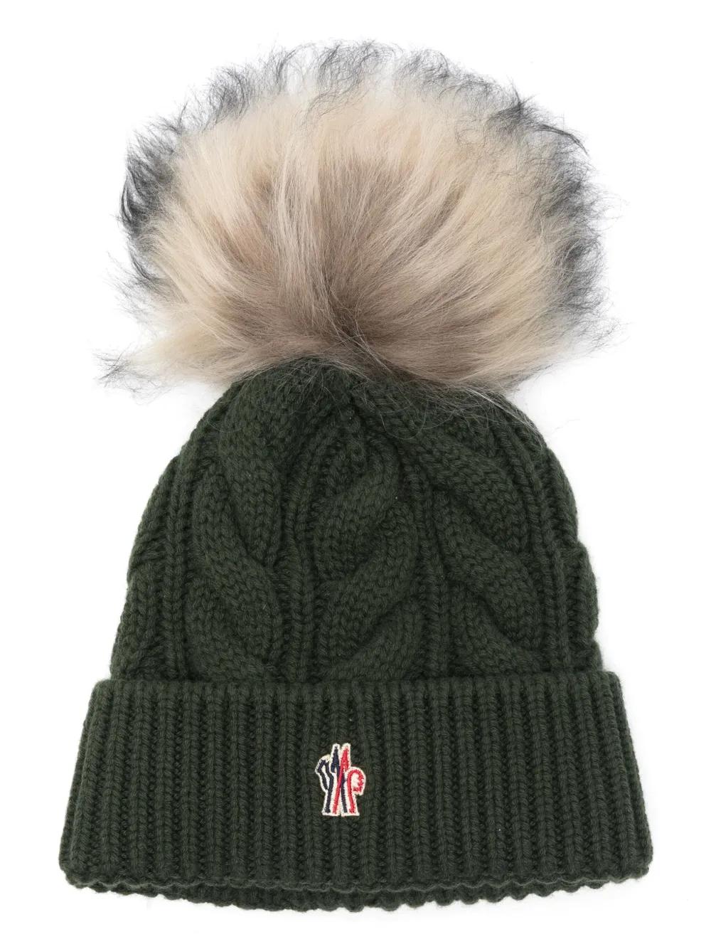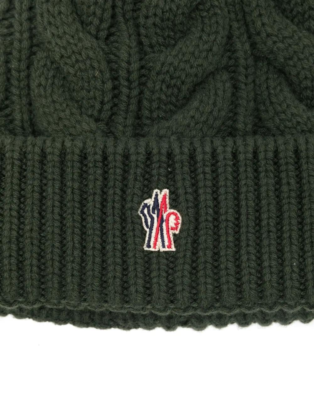 khaki virgin wool-cashmere blend cable knit pompom detail logo patch to the front ribbed-knit turn-up brim