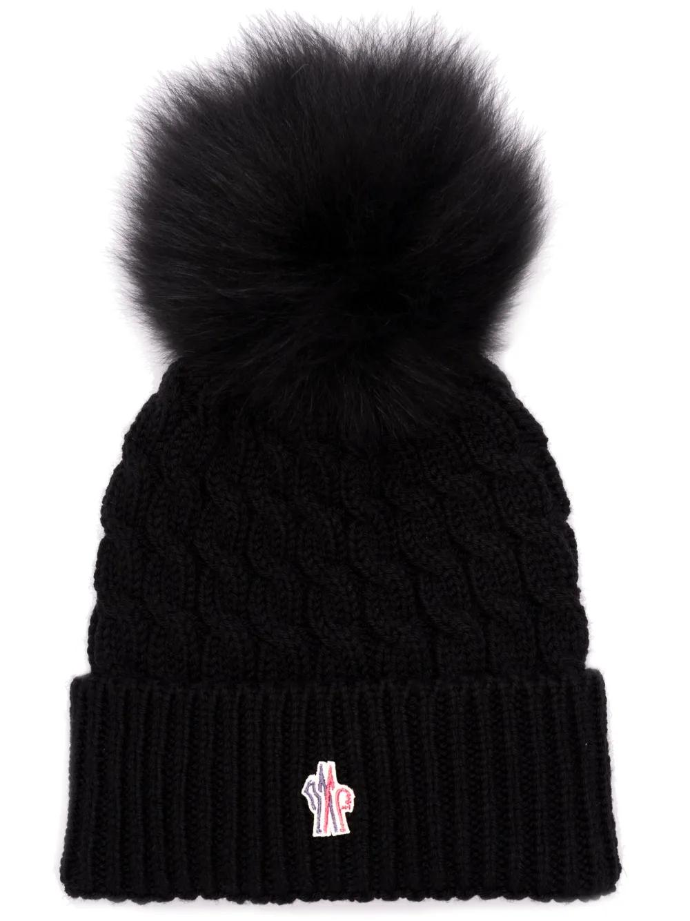 black wool cable knit pompom detail appliqué logo turn-up brim